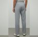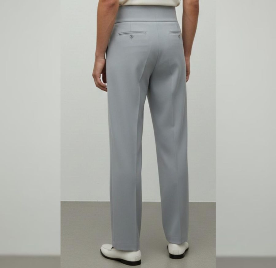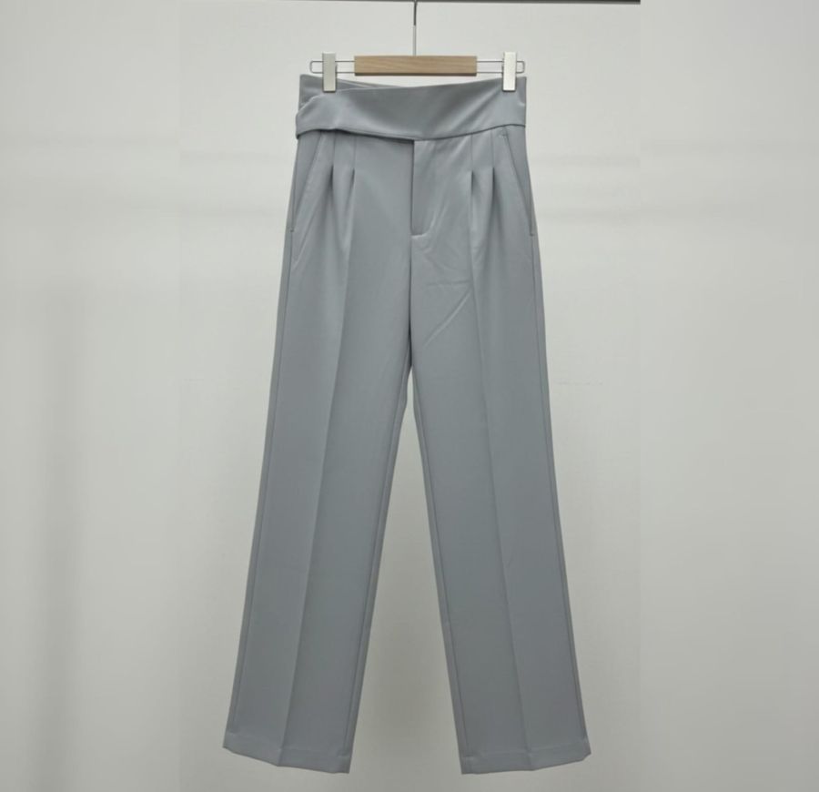 These are High-Waisted Pleated Wide-Leg Trousers in a muted slate gray/blue. They feature a unique asymmetric wrap waistband, front pleats for added volume, and a sharp pressed crease down the center of each leg for a tailored, professional look.