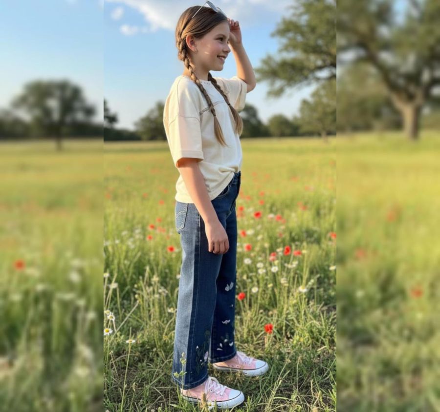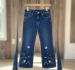 These dark-wash indigo jeans feature a flattering high-rise fit with a modern bootcut/flare leg. The standout feature is the intricate floral and butterfly embroidery adorning the lower half of both legs. Detailed with soft pink blossoms, green vines, and white butterflies, these jeans offer a premium, handcrafted aesthetic. The classic five-pocket design and contrast stitching maintain a timeless denim feel while the embroidery adds a unique, decorative touch.