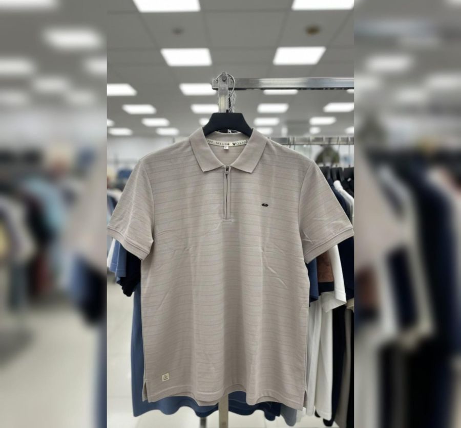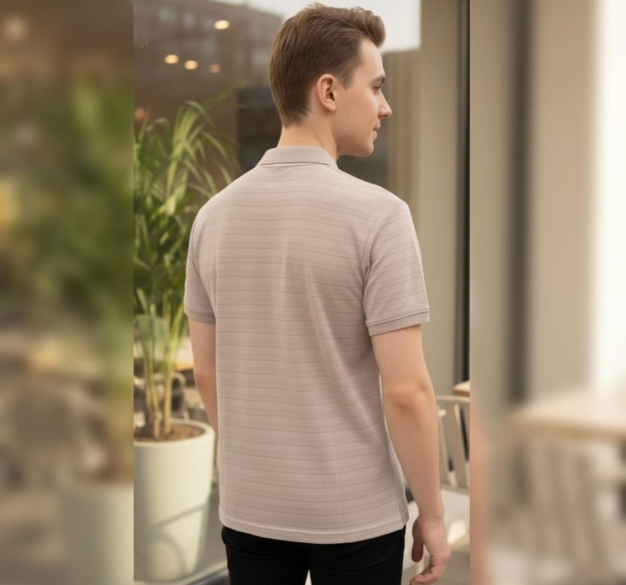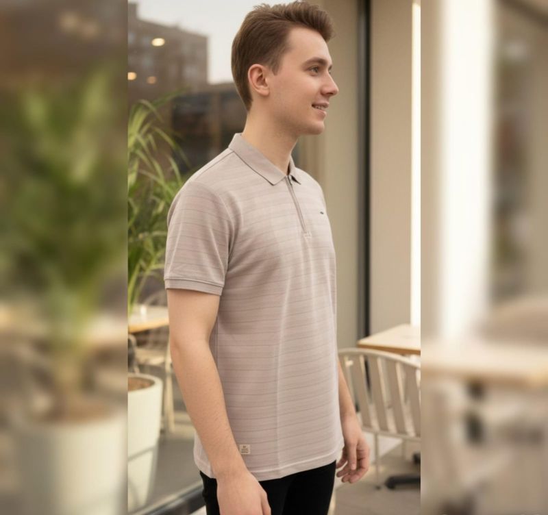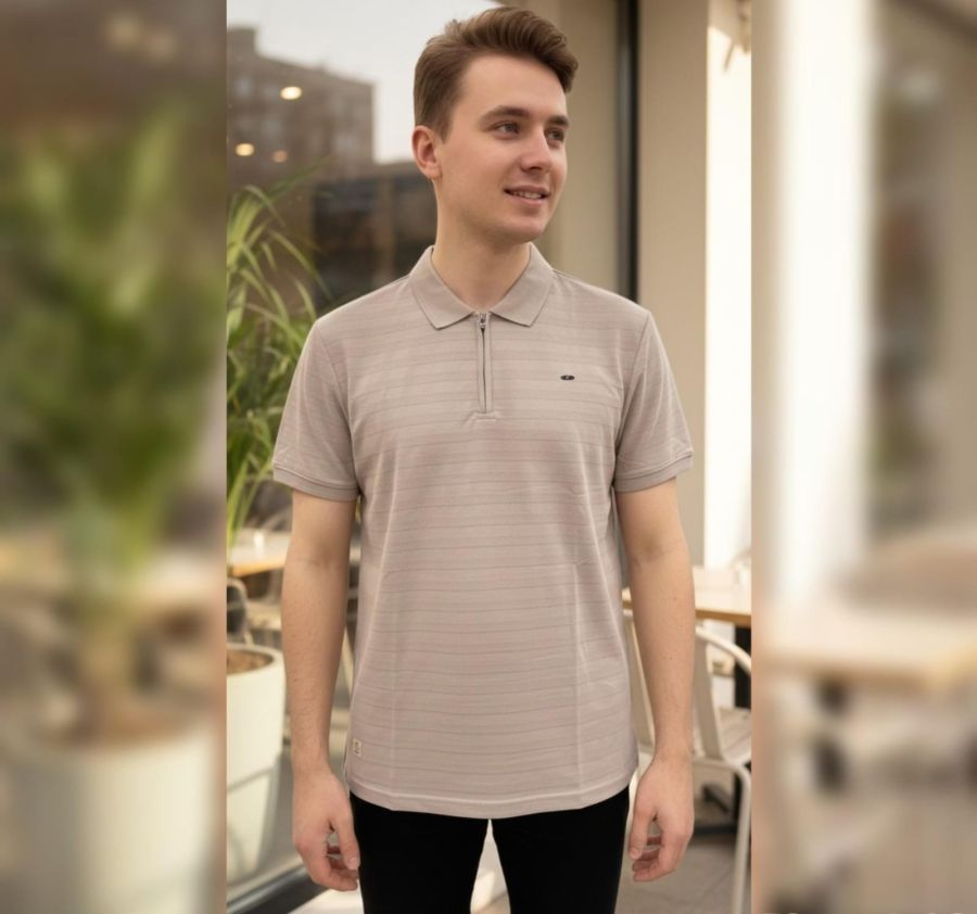 Elevate your casual wardrobe with the Apex Textured Zip Polo. This shirt features a unique Beige-Taupe shade enhanced by a subtle, horizontal micro-stripe texture that adds depth and a premium feel.