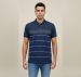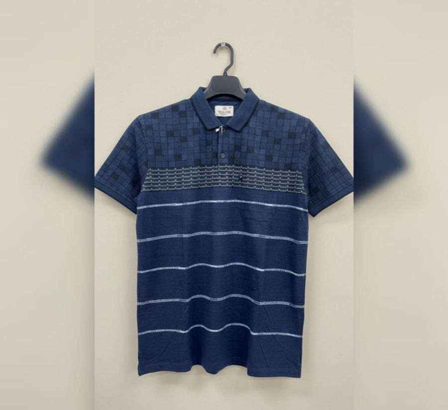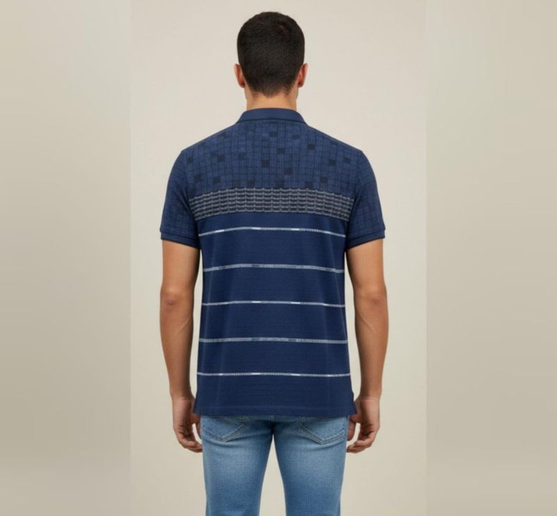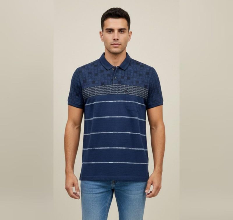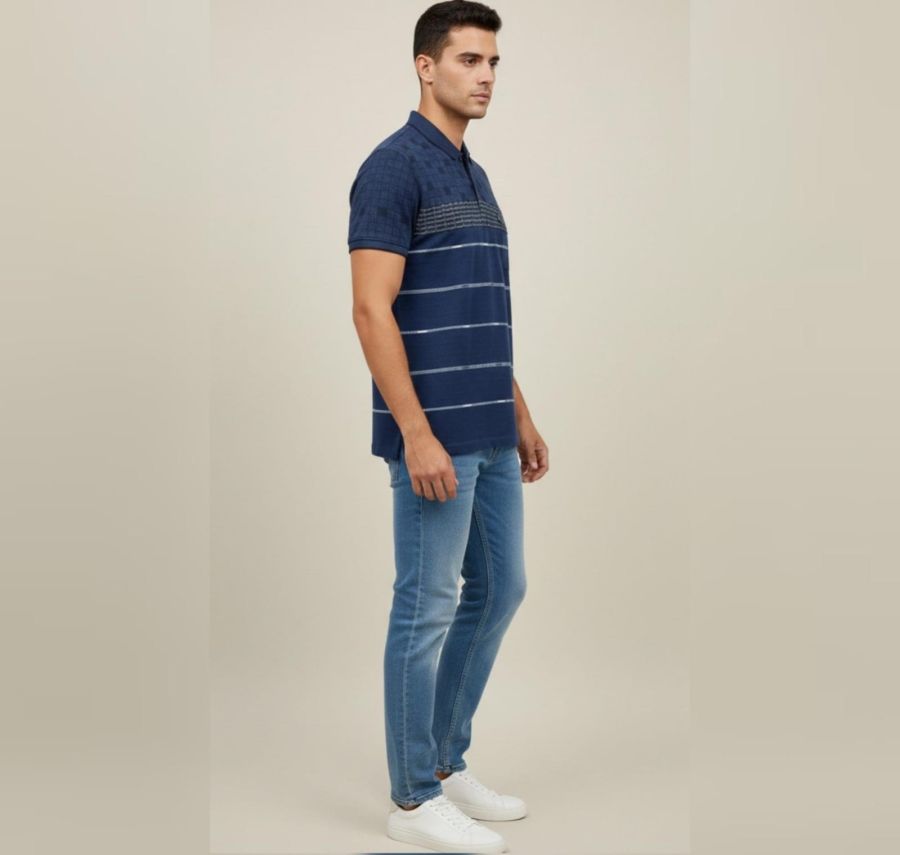 Elevate your casual wardrobe with this Navy Blue Multi-Pattern Polo. Featuring a unique three-tier design, it combines a textured geometric print on the shoulders, a decorative mid-chest border, and sleek horizontal stripes across the body