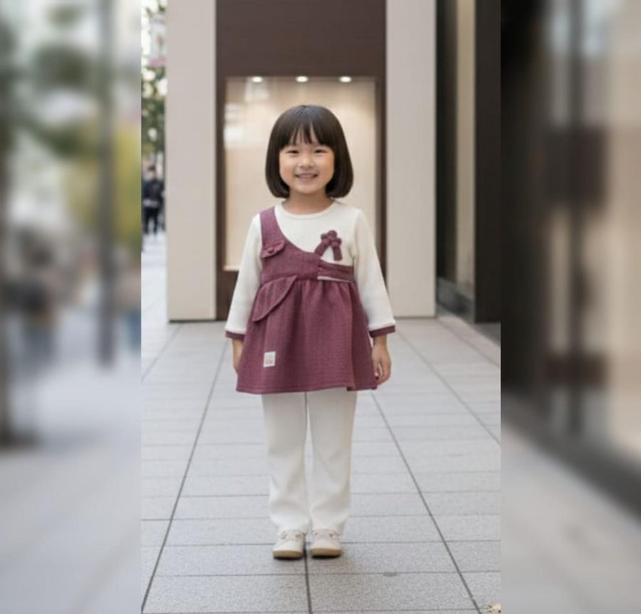 This stylish ensemble features a long-sleeve cream-white inner top seamlessly paired with an attached plum-colored (maroon/purple) sleeveless overlay tunic. The tunic includes a unique asymmetrical neckline, decorative pocket flap, and a sweet bow accent. The look is completed with matching off-white straight-leg trousers.