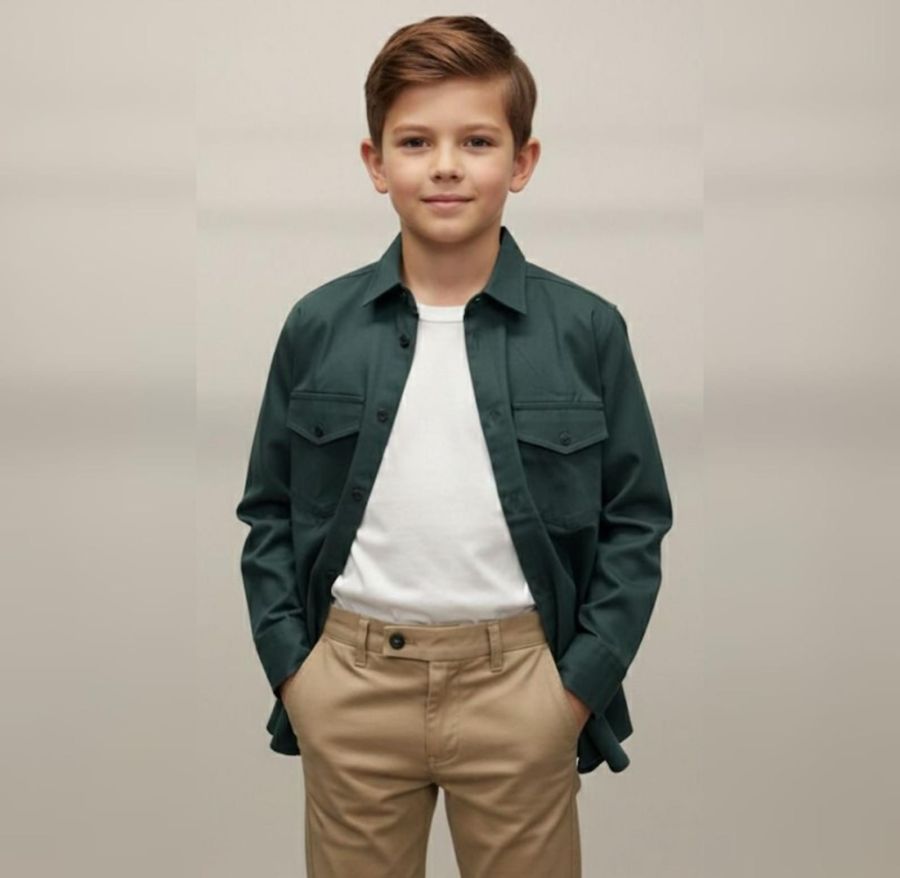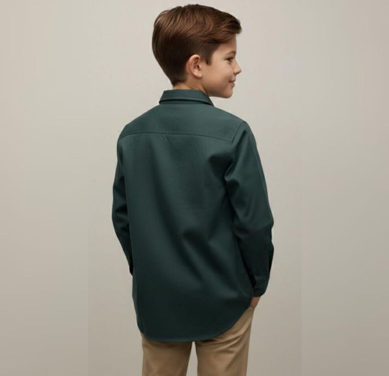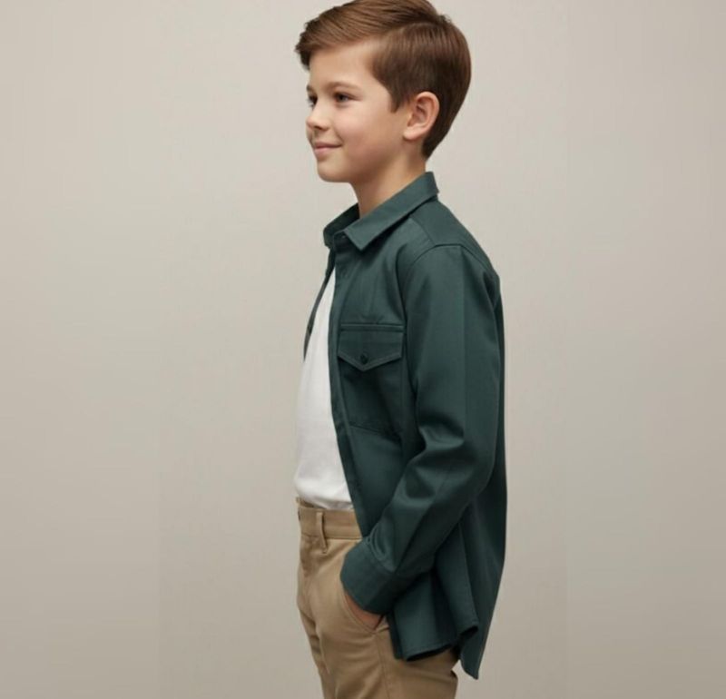 This is a classic workwear-style utility shirt in a deep forest green. It features a rugged, structured design that is perfect for a smart-casual look or as a light "shacket" (shirt-jacket) for a toddler.