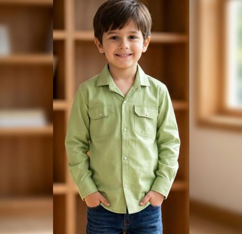 This is a classic sage green utility-style shirt, often referred to as a "shacket" because of its durable fabric and double-pocket design.