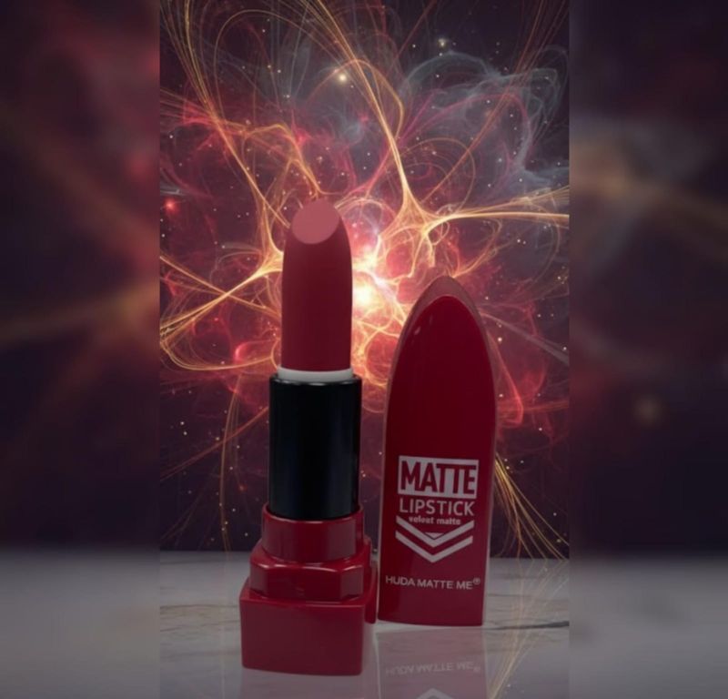 matte bullet lipstick from what appears to be a budget-friendly or inspired line (labeled as "HUDA MATTE ME" on the cap). It is presented in a studio setting with a clear swatch card behind it to demonstrate the true pigment.