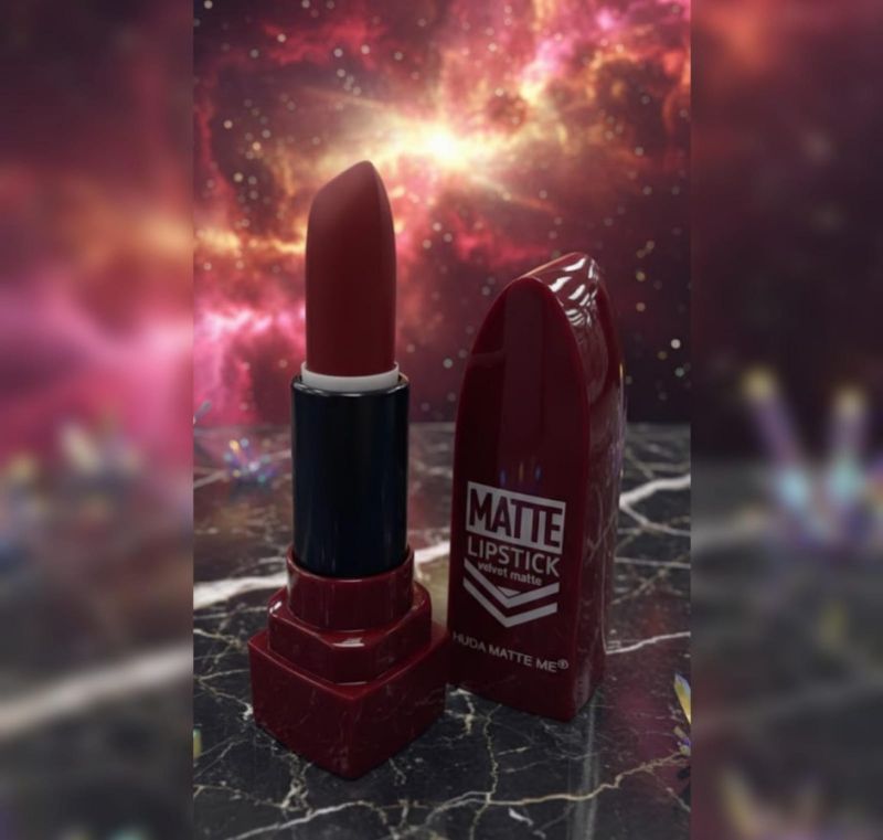 matte lipstick that appears to be a budget-friendly or generic-market cosmetic product. While the branding "HUDA MATTE ME" mimics high-end naming conventions, it is styled as a standalone bullet lipstick
