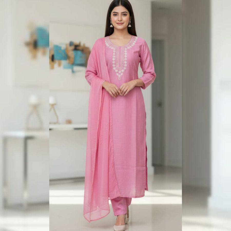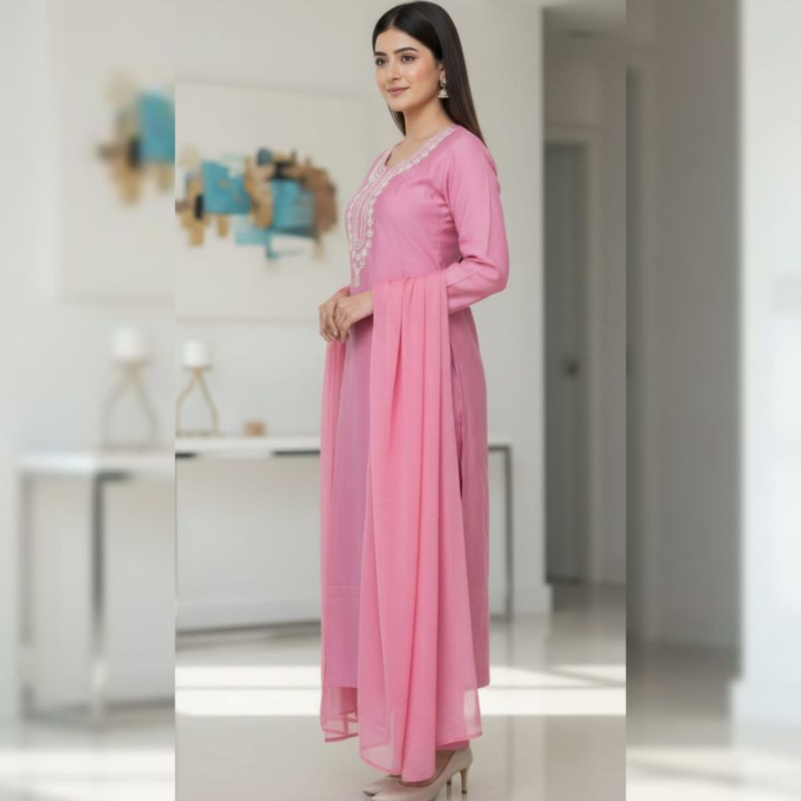 Rani Pink Festive Silk Set: A regal ensemble in vibrant Rani Pink featuring a structured yoke with vertical gold zari stripes. It is paired with a heavy Banarasi-style dupatta showcasing WHITE woven floral motifs and a broad decorative border.