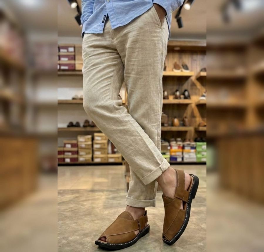 A pair of Peshawari Chappals, a classic piece of traditional footwear known for its durability and distinct square-toe design. These are particularly popular for formal ethnic wear or smart-casual South Asian attire.