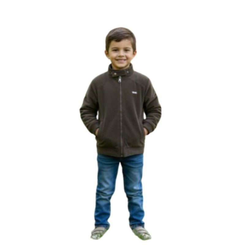 A child stands confidently with hands in jacket pockets, facing forward against a clean white background.