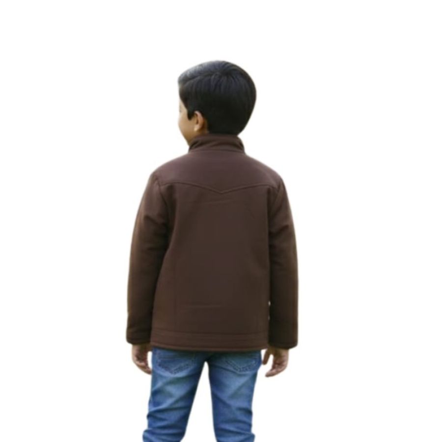 A child stands confidently with hands in jacket pockets, facing forward against a clean white background.