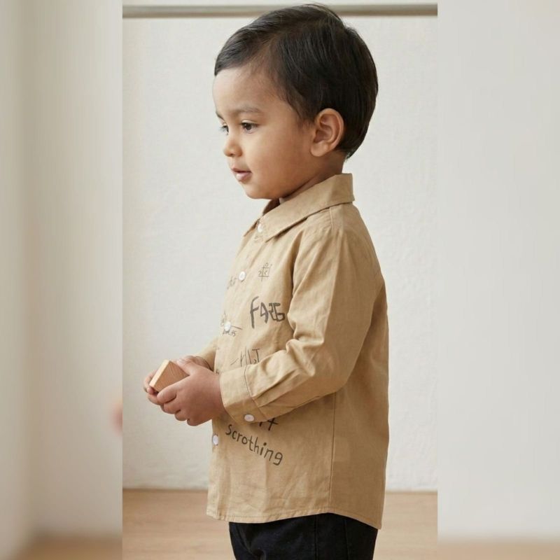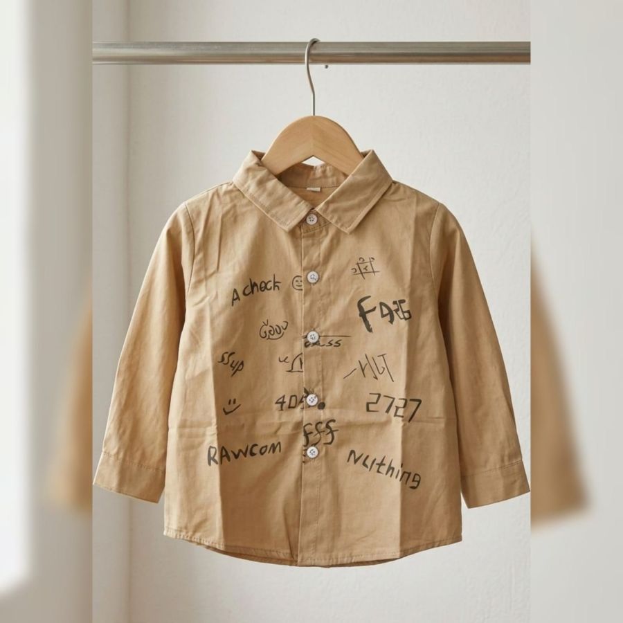This is a toddler or young child's long-sleeved button-down shirt. It features a casual, stylized design inspired by graffiti or handwritten doodles.