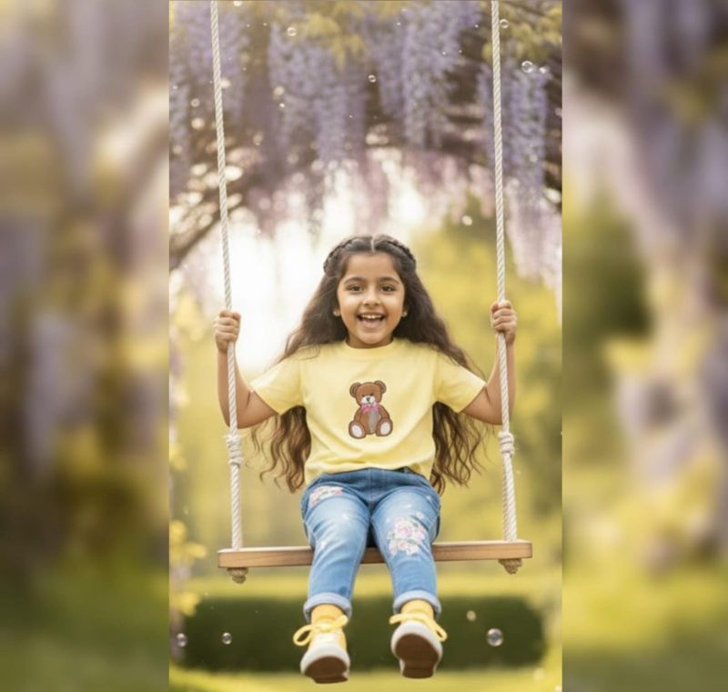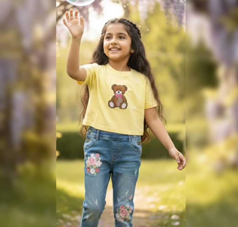 Brighten up your little one's wardrobe with this cheerful yellow graphic t-shirt. Featuring a charming teddy bear print with leopard-print accents and a cute pink bow, this tee is designed for maximum comfort and style during playtime or outings.