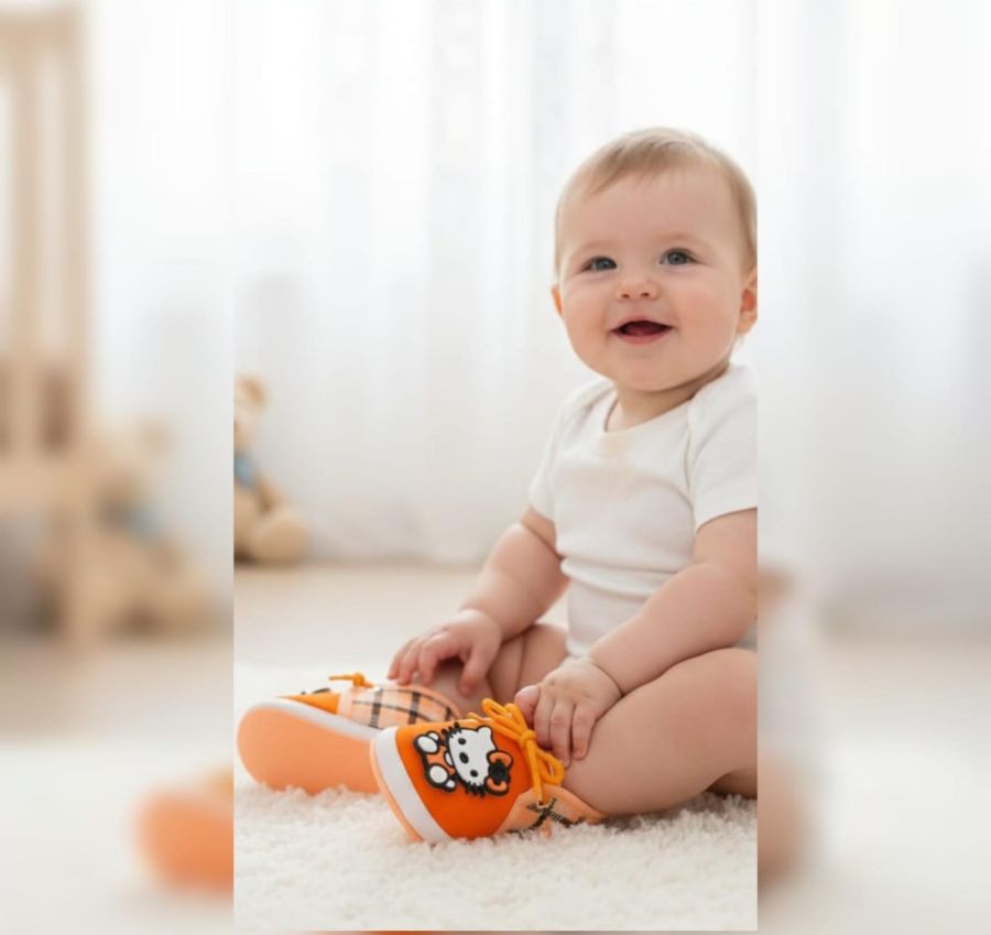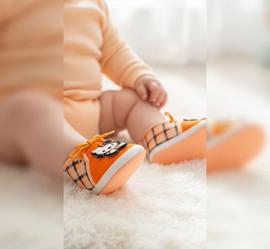 Brighten up your little one's wardrobe with our Sunny Paws "Kitty-Pop" Booties. Featuring a vibrant sunset-orange canvas paired with a classic plaid heel, these shoes are as stylish as they are sweet.