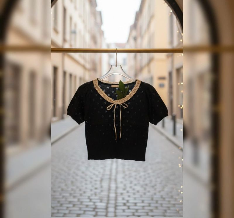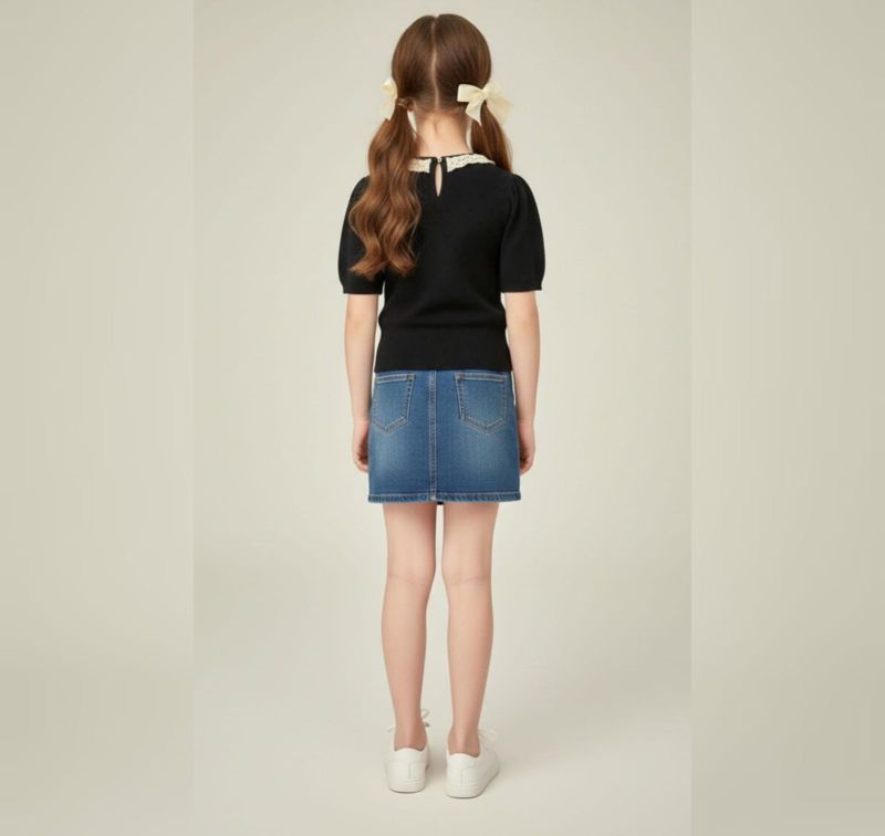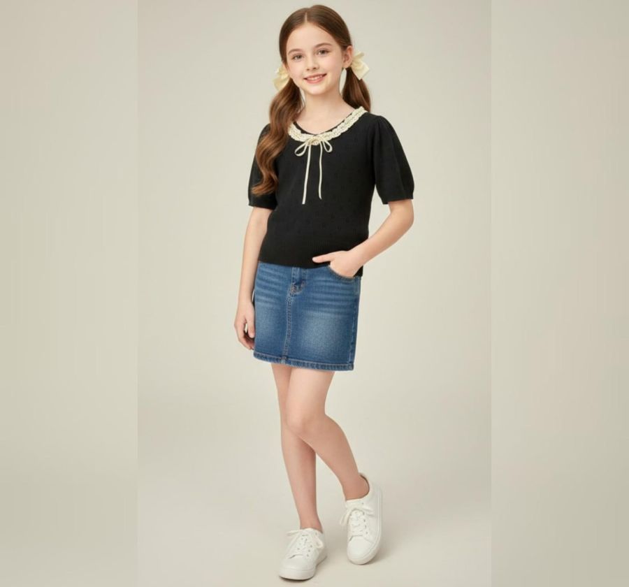 This dainty and feminine knit top is a perfect blend of vintage charm and modern comfort. Featuring delicate open-knit patterns and a decorative lace-trimmed collar, it is an ideal choice for creating a polished yet sweet look for young girls.