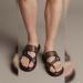 Design: A sophisticated cross-strap (toe-loop) style featuring an adjustable brass-tone side buckle for a custom fit.