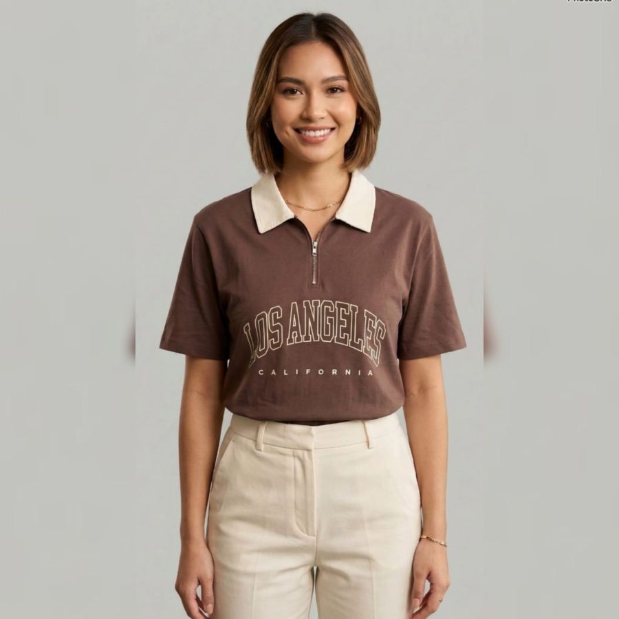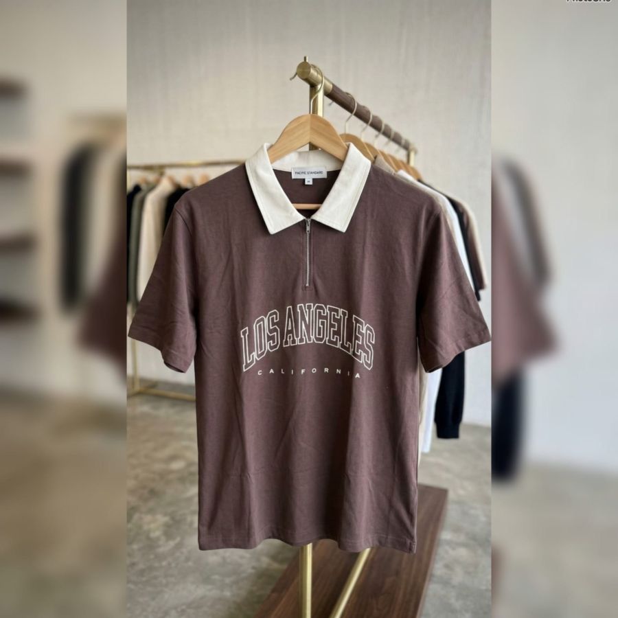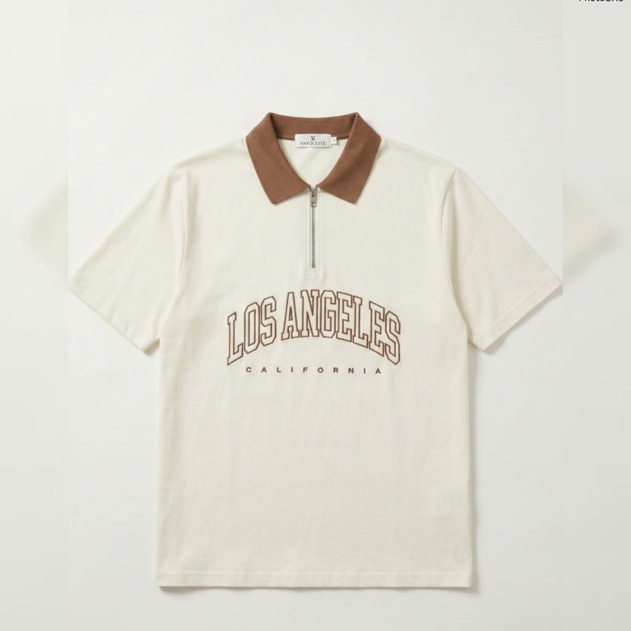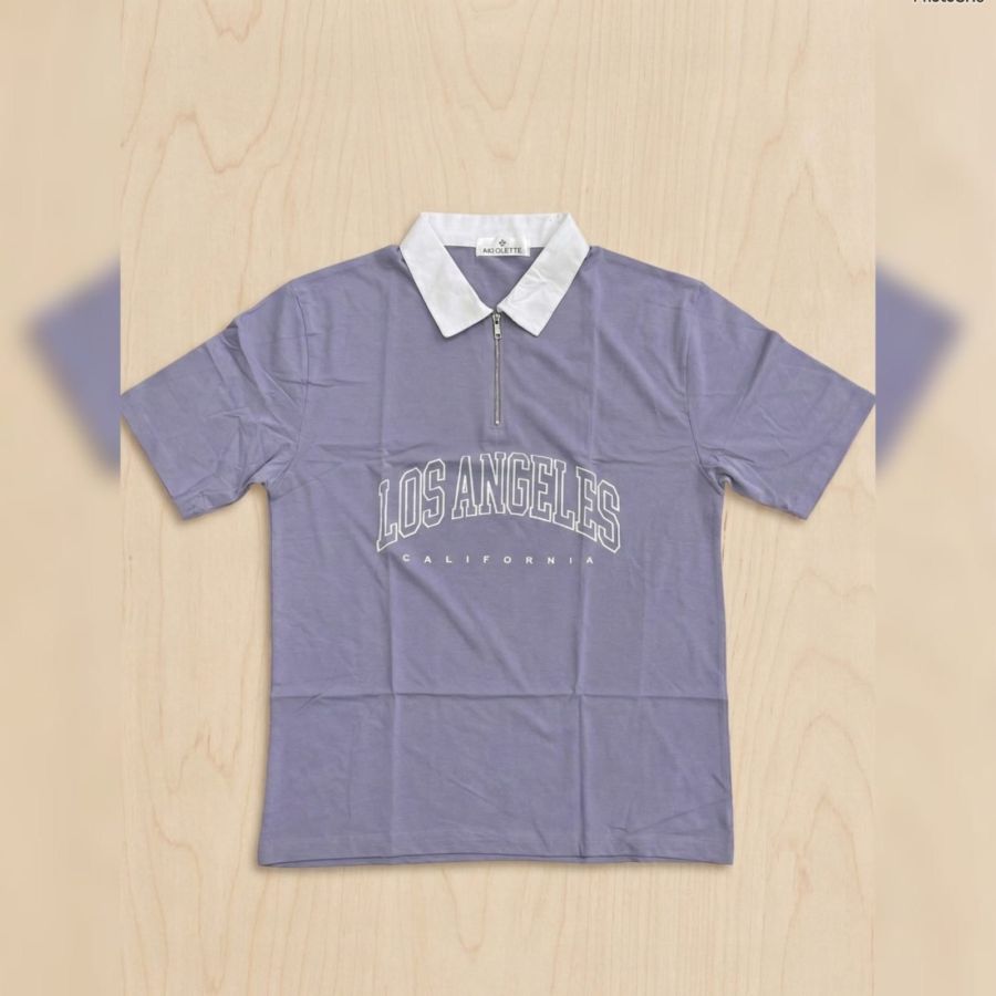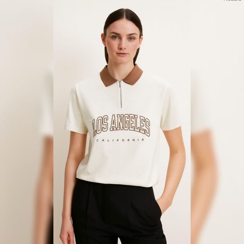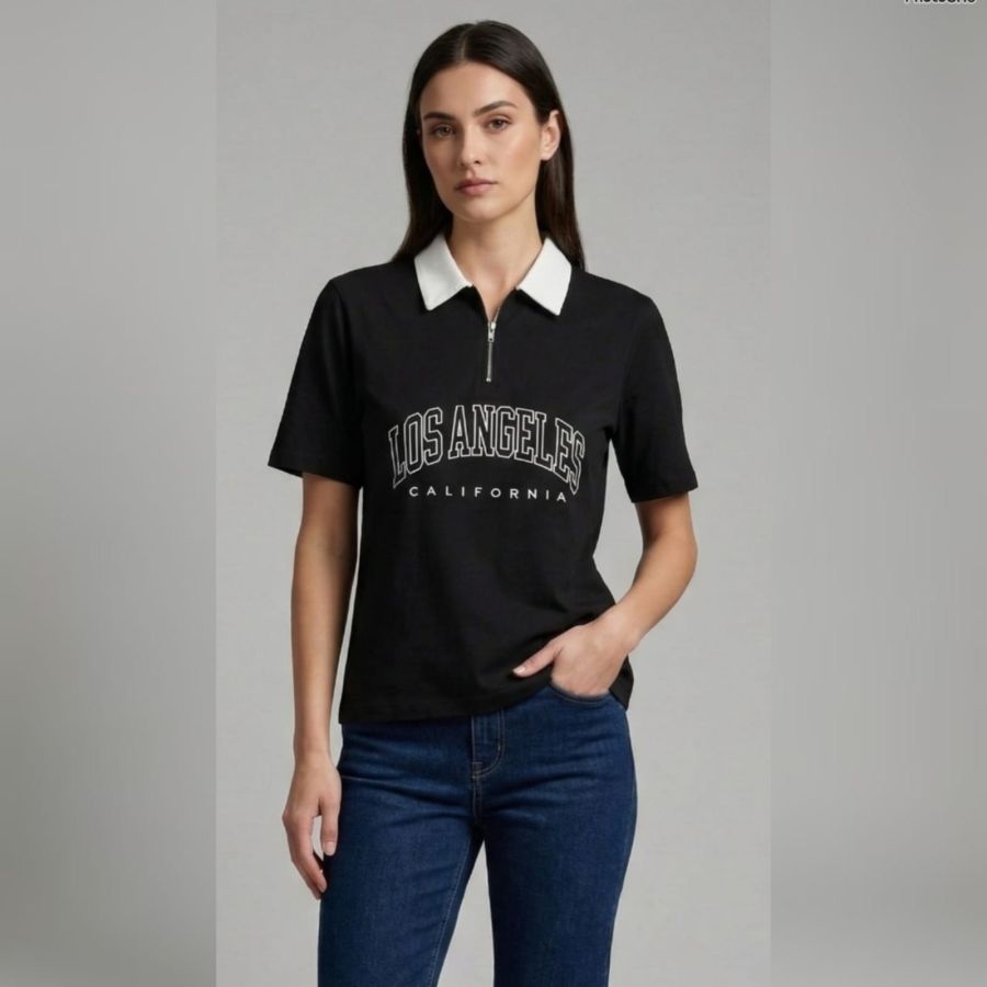 A contemporary take on the classic polo, this black jersey top features a contrasting white collar and a modern zipper neckline. Embellished with a crisp "LOS ANGELES CALIFORNIA" varsity-style graphic, it offers a preppy yet edgy aesthetic perfect for everyday urban wear.