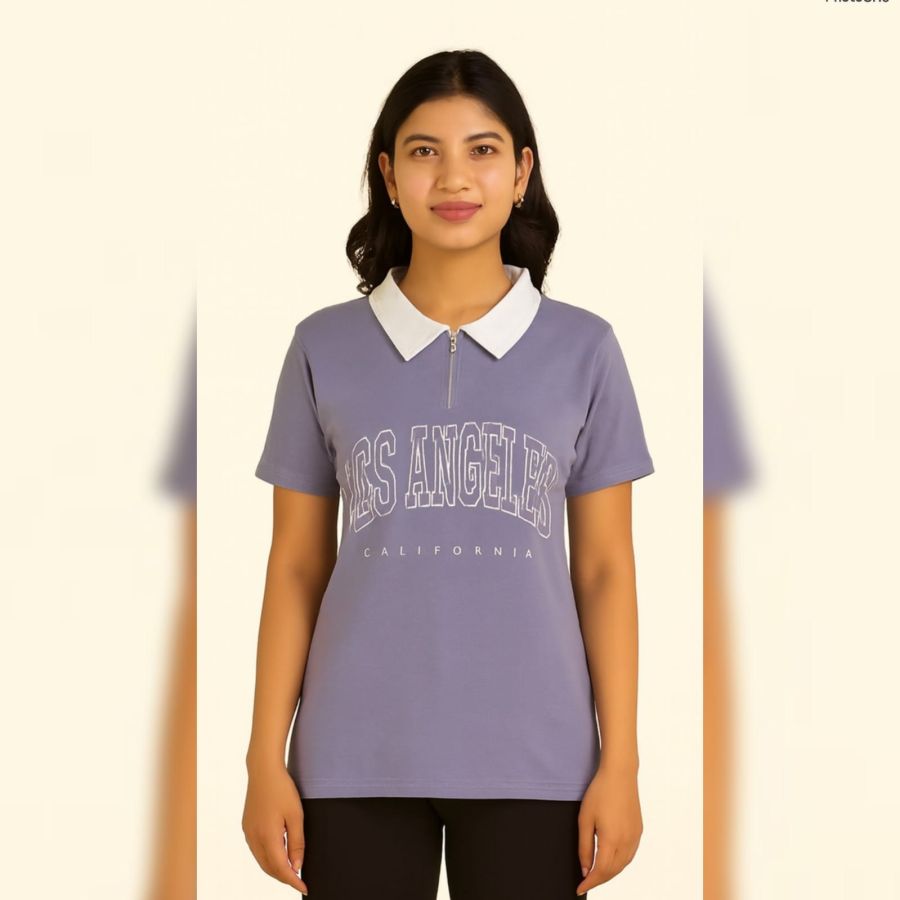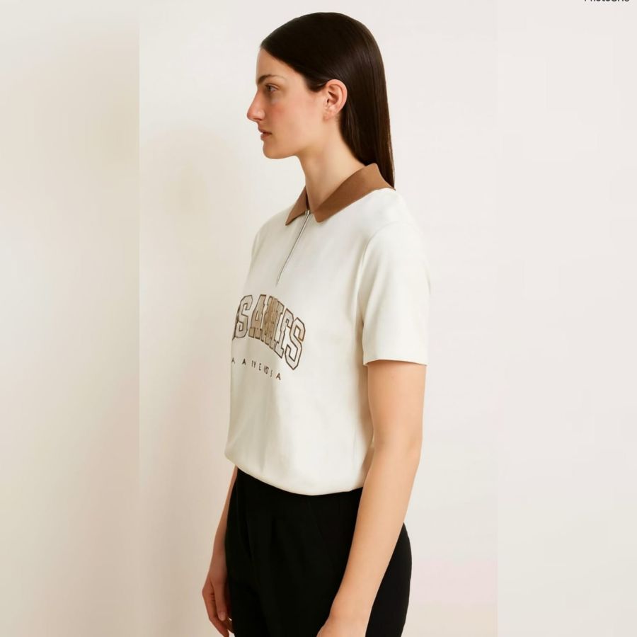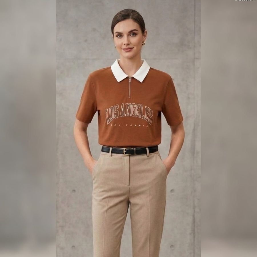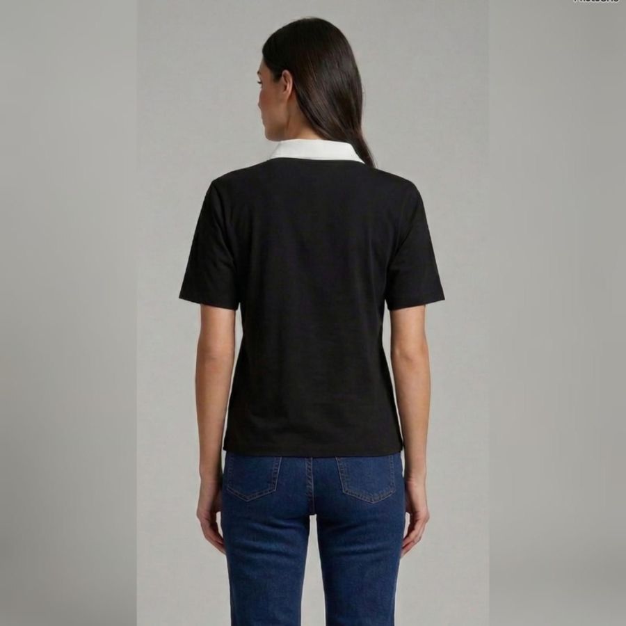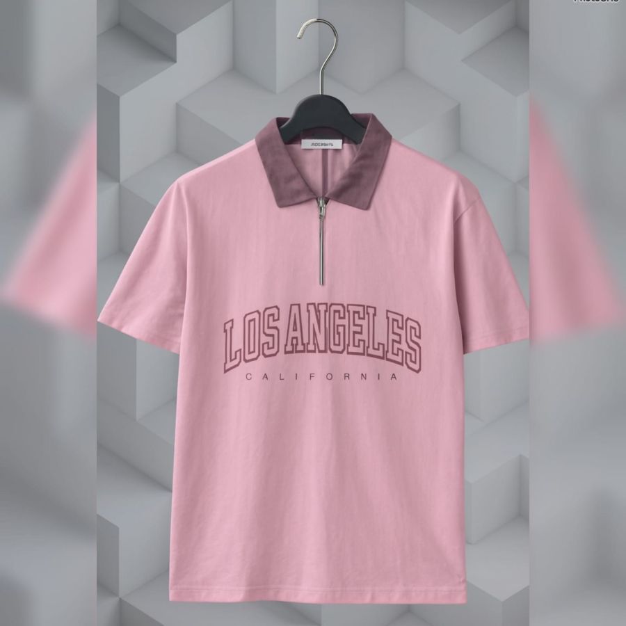 A contemporary take on the classic polo, this black jersey top features a contrasting white collar and a modern zipper neckline. Embellished with a crisp "LOS ANGELES CALIFORNIA" varsity-style graphic, it offers a preppy yet edgy aesthetic perfect for everyday urban wear.