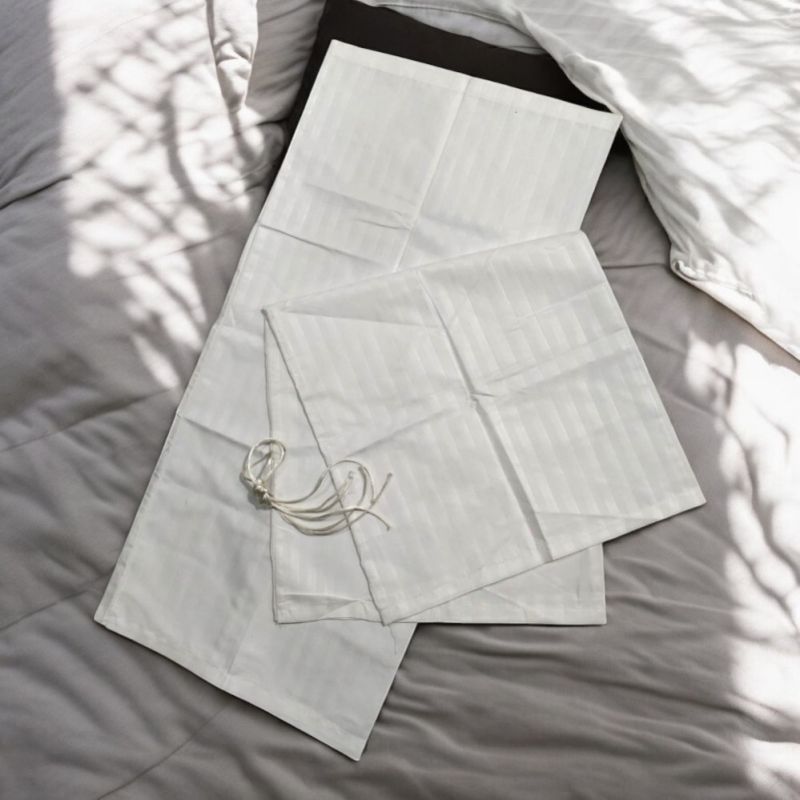 A sleek bolster cover made of cotton fabric in a crisp white with subtle vertical stripes.