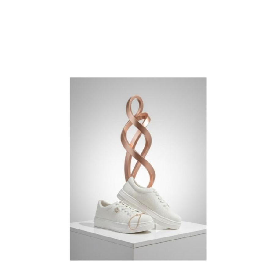 1. Design aur Aesthetics Style: Yeh ek modern lifestyle casual sneaker hai jisme platform sole diya gaya hai. Iska design "clean girl aesthetic" aur minimalist fashion se prerit hai. Color: Yeh poori tarah se pristine white (ekdam safed) hai, jo ise ek versatile aur premium look deta hai. Decorative Details: Isme do khaas cheezein hain jo ise normal jooton se alag banati hain: Gold Charm: Laces ke paas ek chhota sa sunhera (gold-tone) logo ya flower-shaped charm hai.