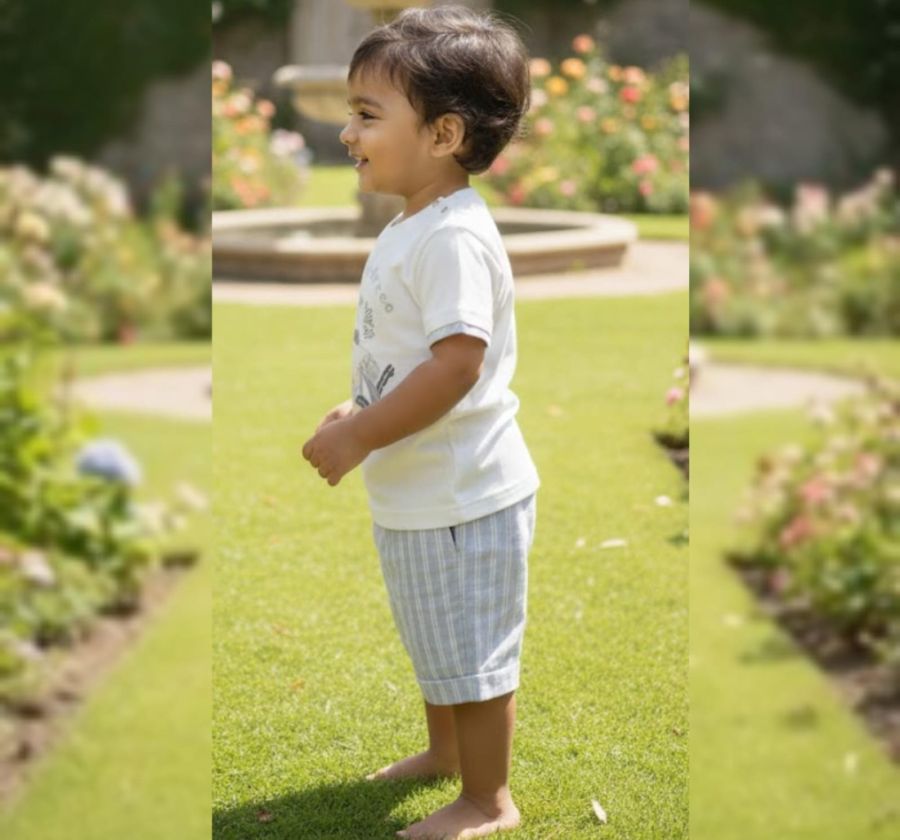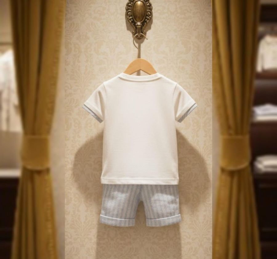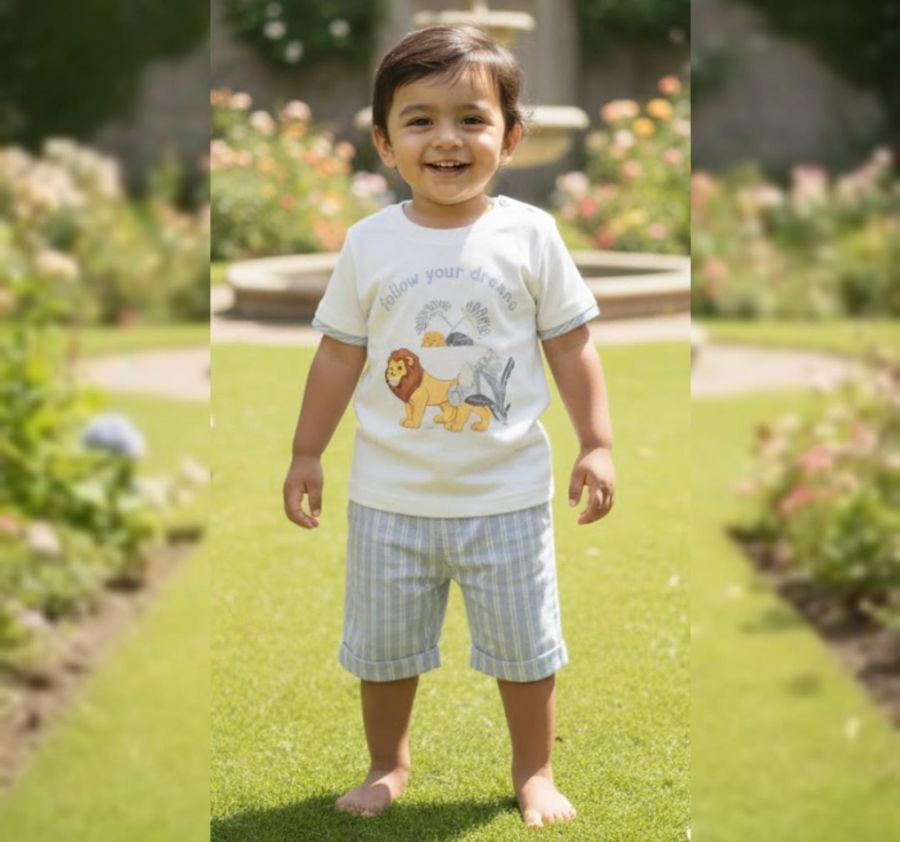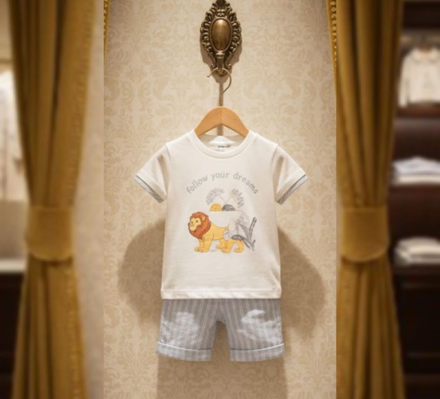 Add a touch of jungle-inspired charm to your little one's wardrobe with this premium two-piece set. The set features a soft off-white cotton T-shirt with a cute lion graphic and the motivational quote "Follow your dreams