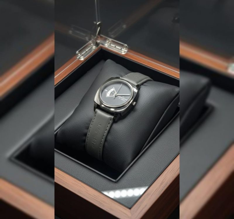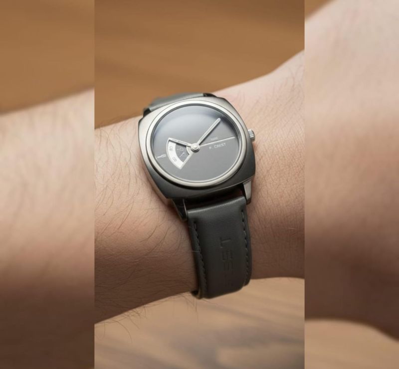 Featuring a sophisticated matte slate dial and a unique semi-circular date/detail window, this watch blends vintage aesthetics with futuristic minimalism
