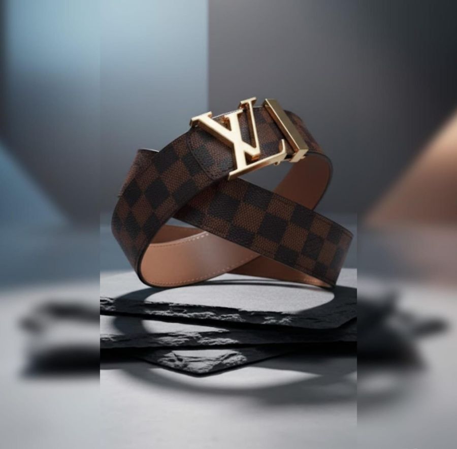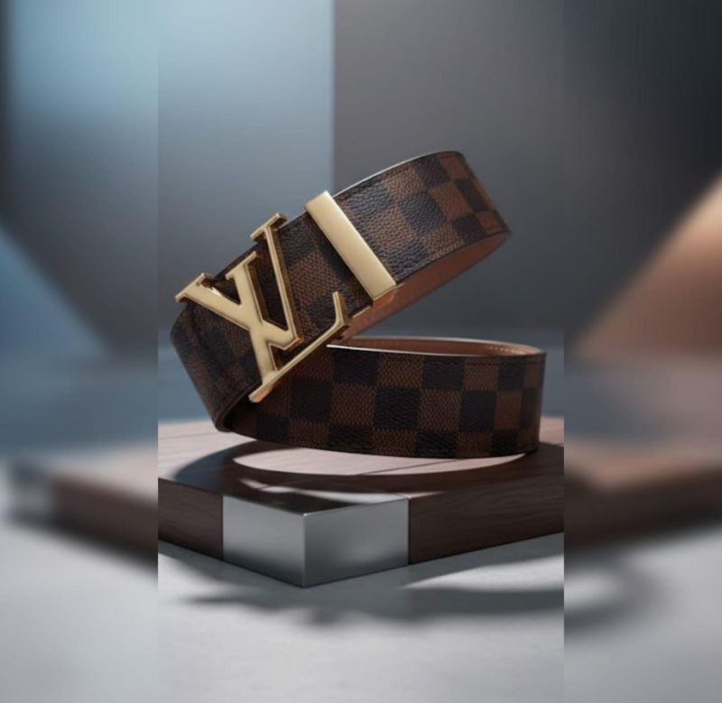 a high-end fashion accessory, specifically a belt that mirrors the iconic aesthetic of the luxury brand Louis Vuitton.