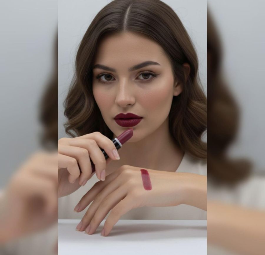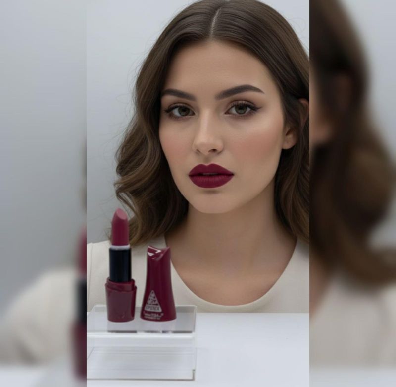 The item is a matte-finish lipstick presented in a deep berry or plum shade. The packaging suggests a budget-friendly or mass-market brand, focusing on bold pigmentation and long-wear claims.
