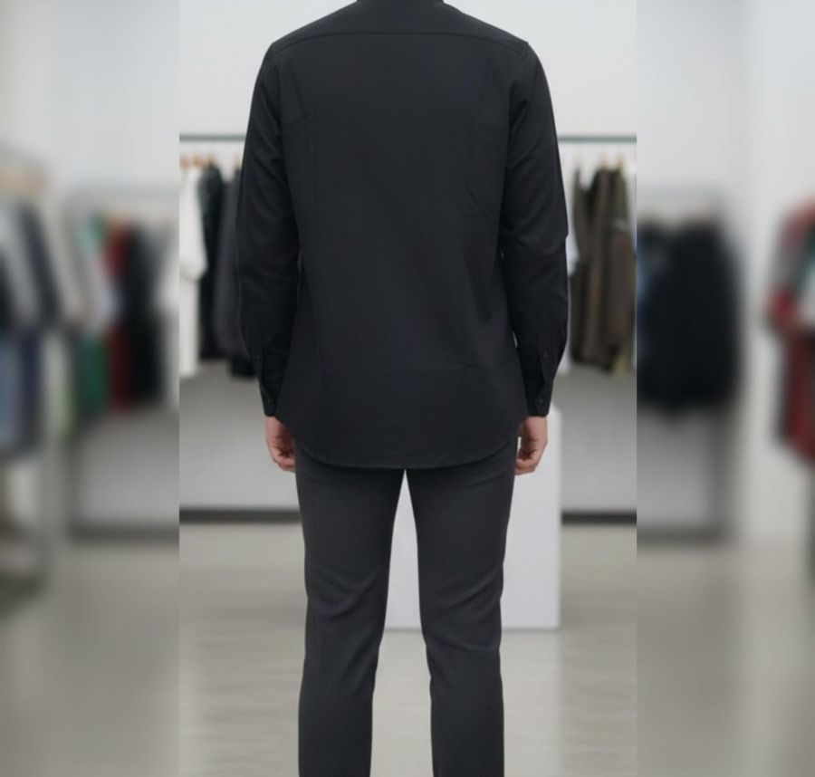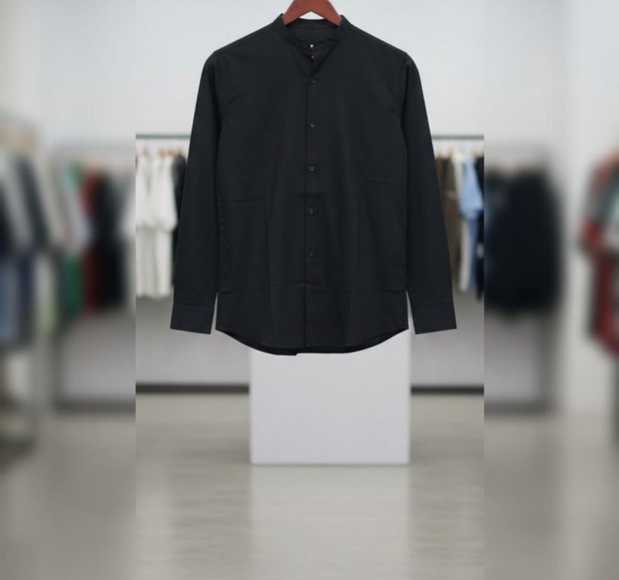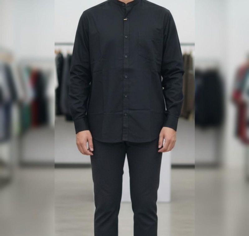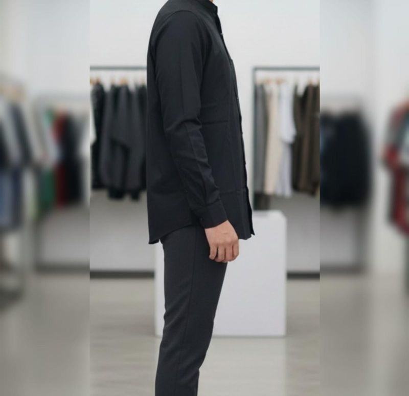 t Mandarin collar shirt (also frequently called a Grandad collar) in a deep black. It’s a versatile piece that sits right in the "sweet spot" between casual and formal.