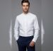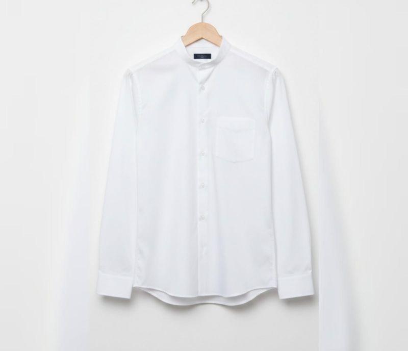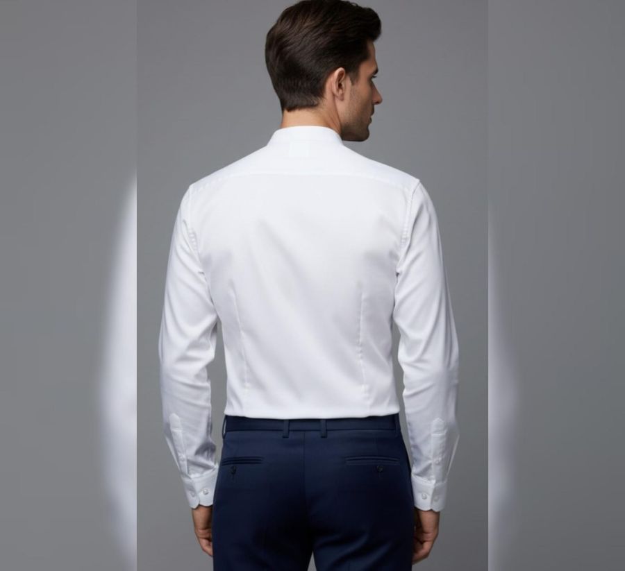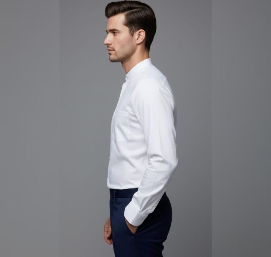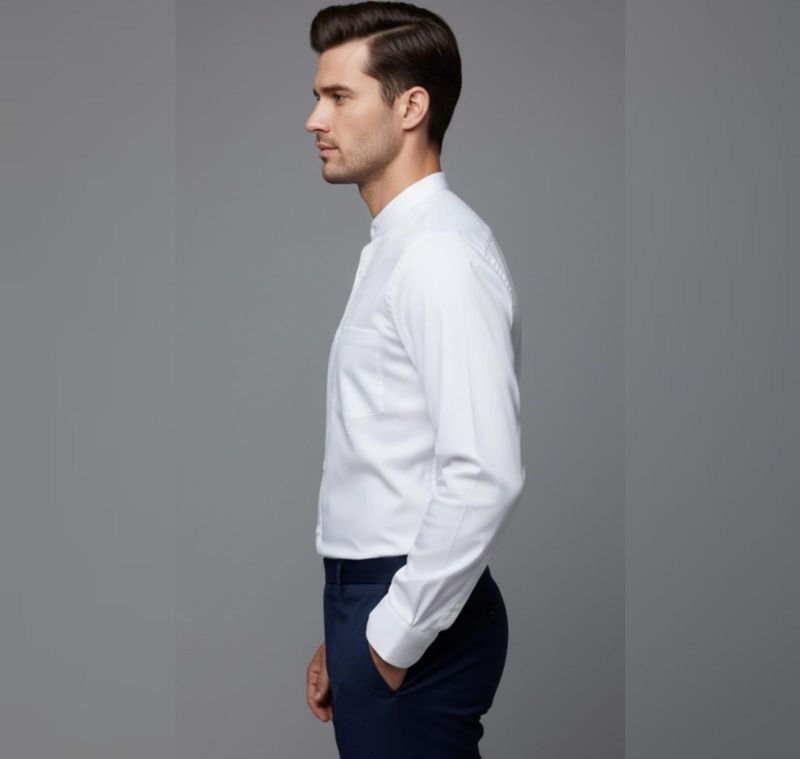 Collar Style: It features a Mandarin collar (also known as a band collar), which lacks the traditional fold-over points for a sleek neckline.