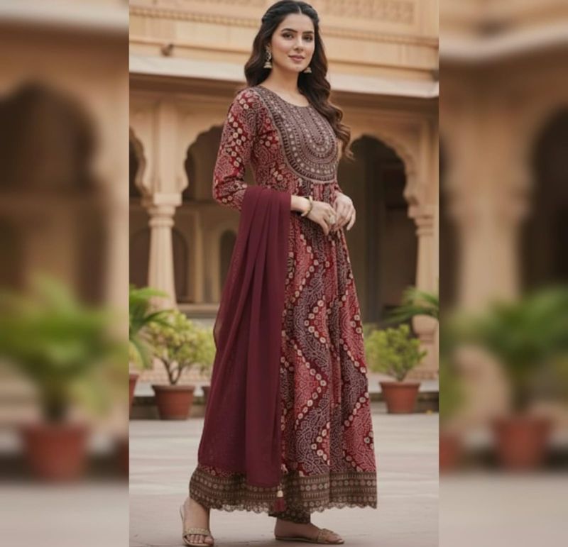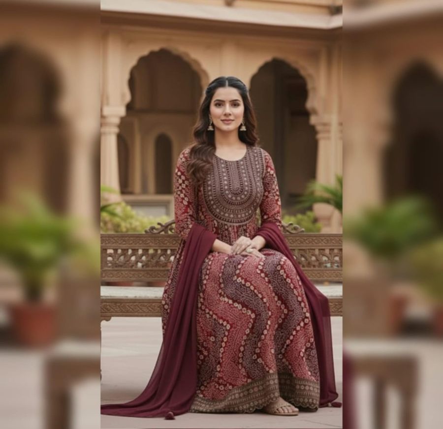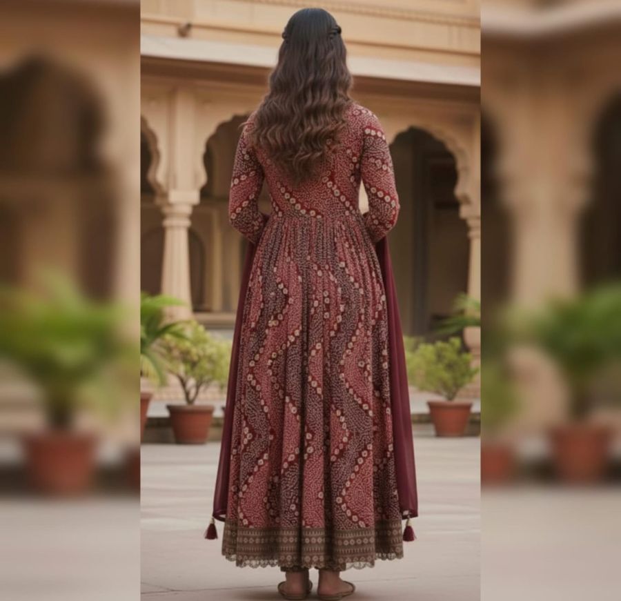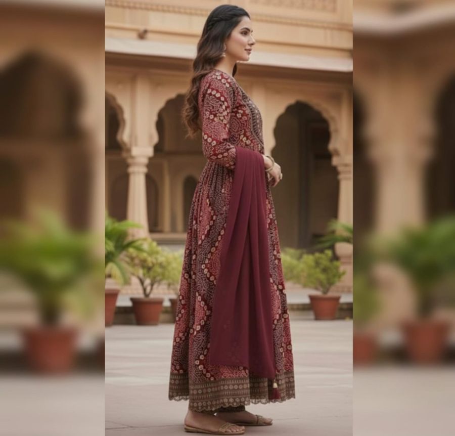 Step into timeless grace with the Maroon Mosaic Anarkali Set. This sophisticated three-piece outfit features a floor-length Anarkali kurta showcasing a traditional Bandhani-inspired geometric pattern in rich maroon and earthy tones. The bodice is highlighted by a heavy, circular embroidered yoke, while the flared hem is finished with an intricate ethnic border.