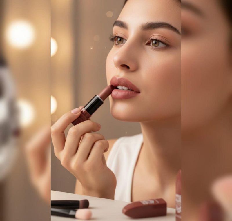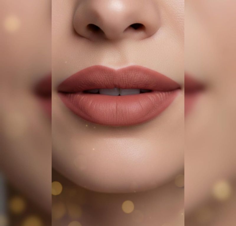 The Lipstick: A bullet-style lipstick in a warm terracotta or dusty rose shade. The texture appears smooth and velvety, consistent with its "Matte" labeling.