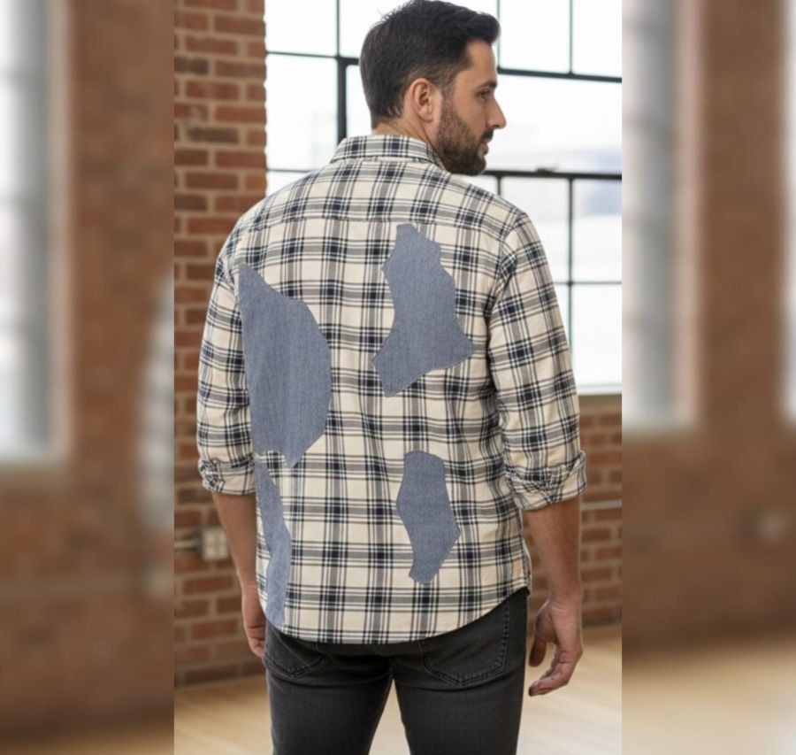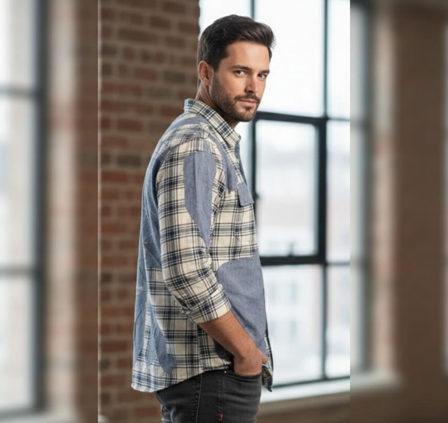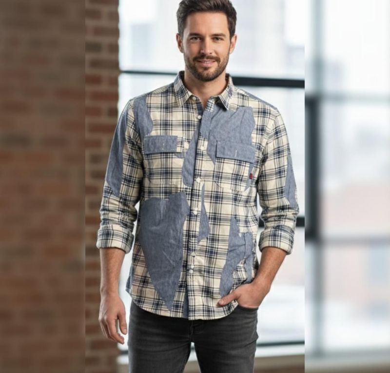 Step away from the ordinary with this creative cream and navy plaid shirt. It stands out with unique, irregularly shaped denim-blue fabric patches layered over the traditional check pattern, giving it a rugged, artistic feel. This long-sleeved piece includes dual chest pockets with button flaps and a standard point collar. Crafted for comfort and style, it’s the perfect conversation starter for casual gatherings.