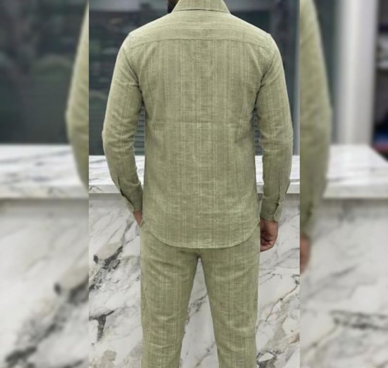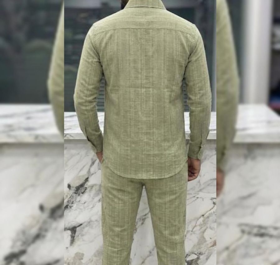Redefine casual comfort with the Sage Horizon set. This matching shirt and trouser duo is crafted from a uniquely textured fabric featuring subtle horizontal micro-stripes. It’s the perfect blend of effortless style and modern sophistication for the man on the move.