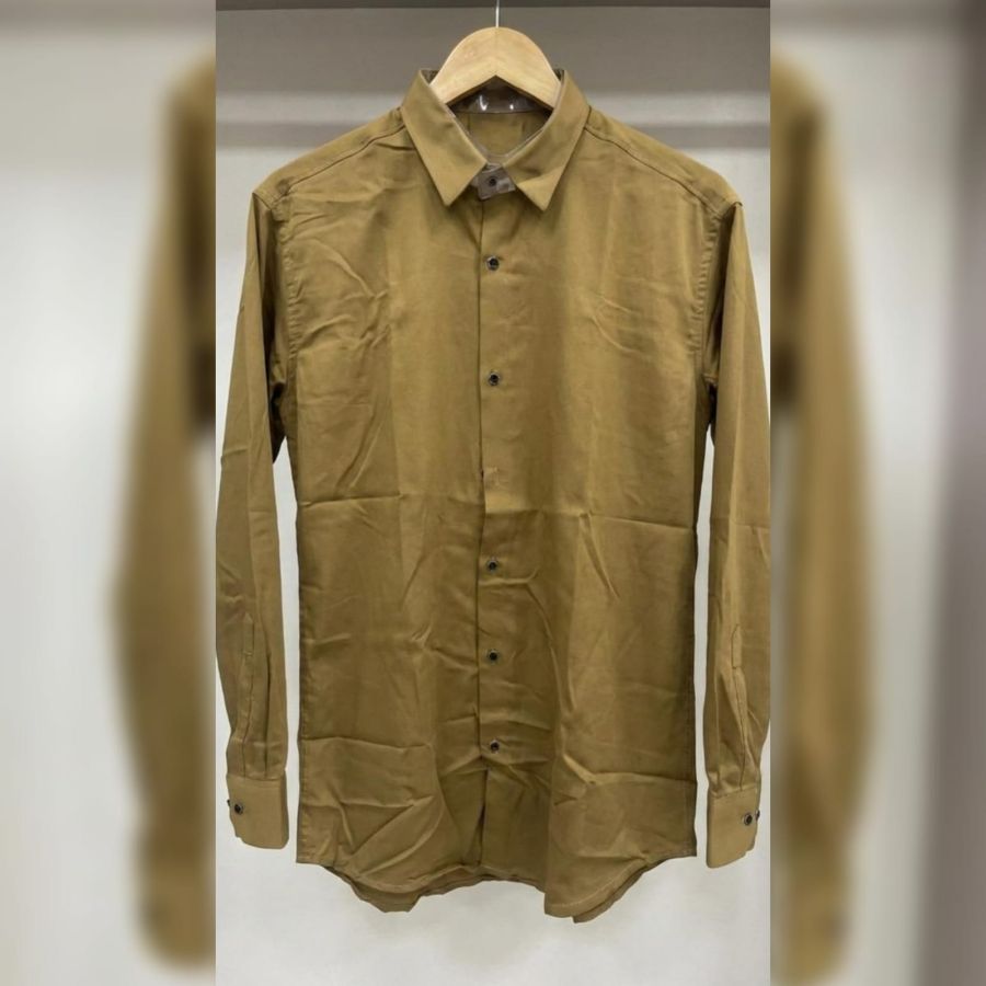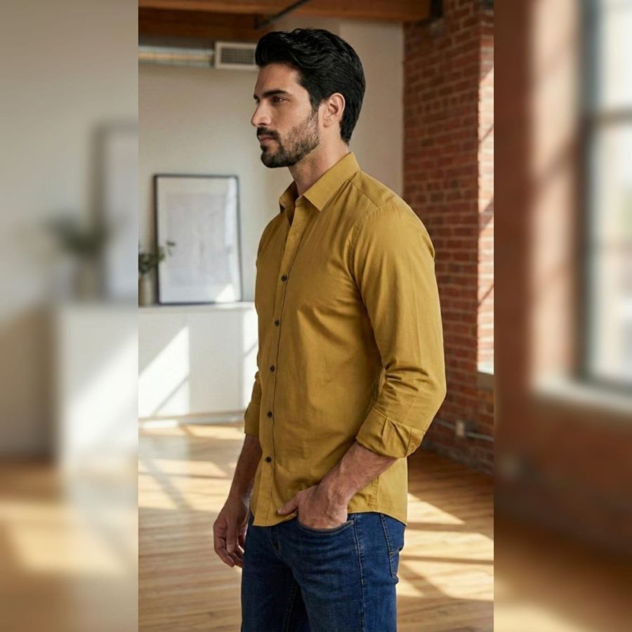 That is a versatile mustard/khaki button-down shirt! It has a clean, minimalist aesthetic that works well for both smart-casual and rugged looks.SEMI-