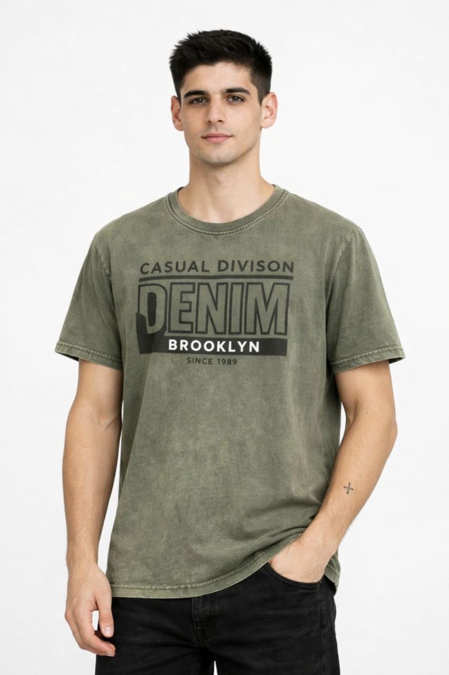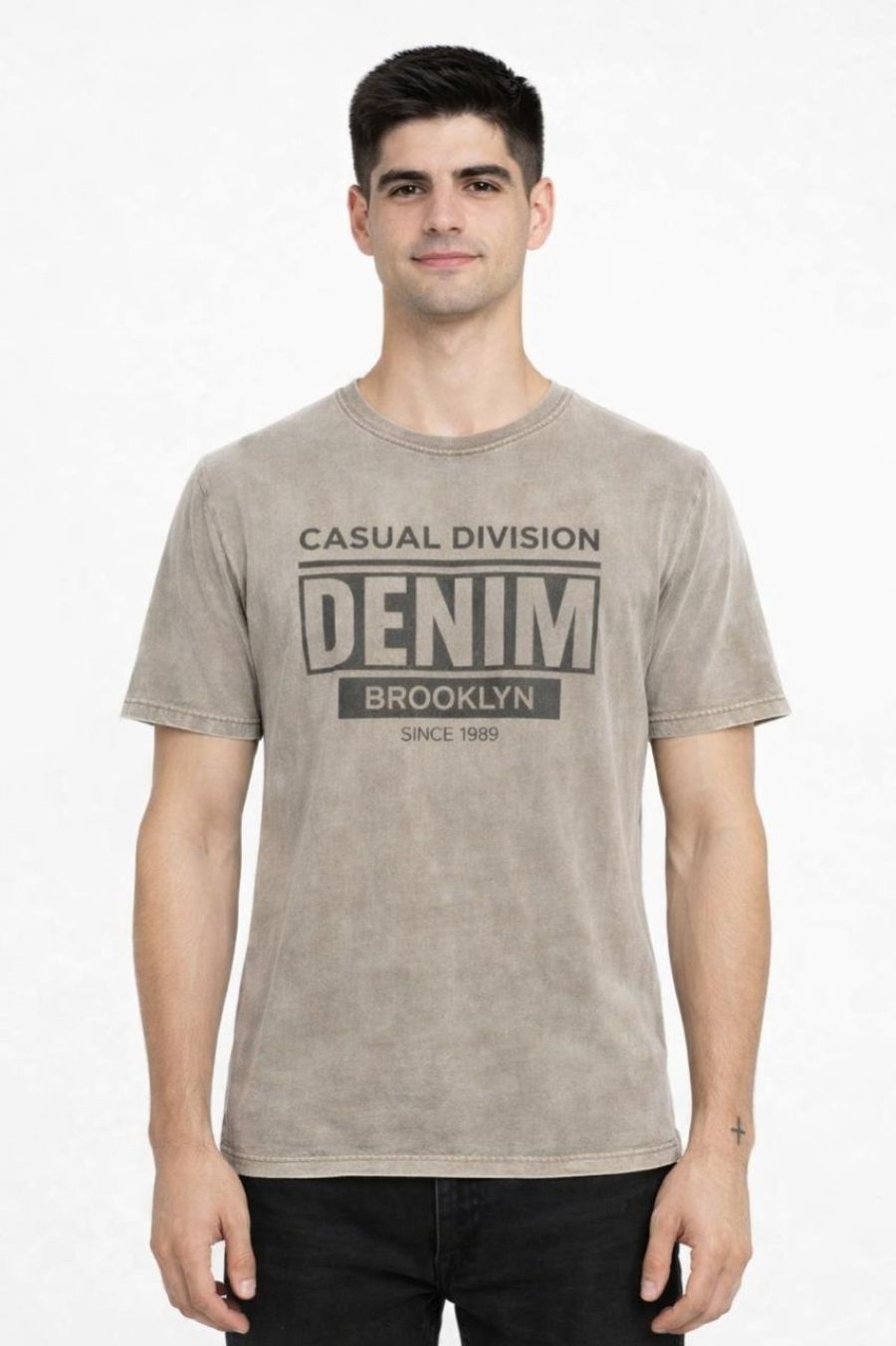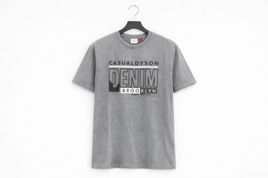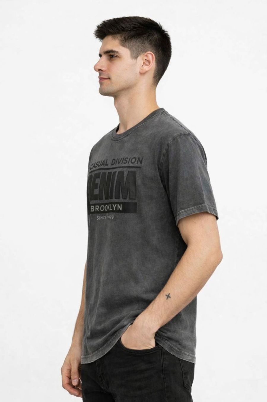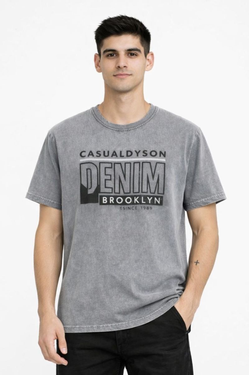 Fabric & Finish: The shirt has a distinct acid-wash or mineral-wash finish in a charcoal grey color, giving it a soft, "lived-in" vintage texture.