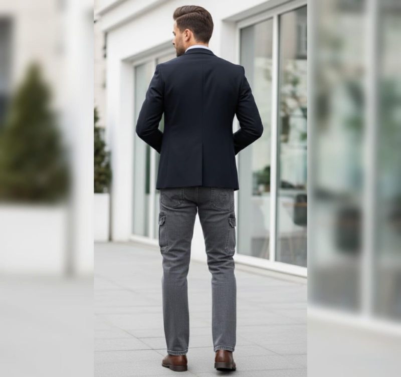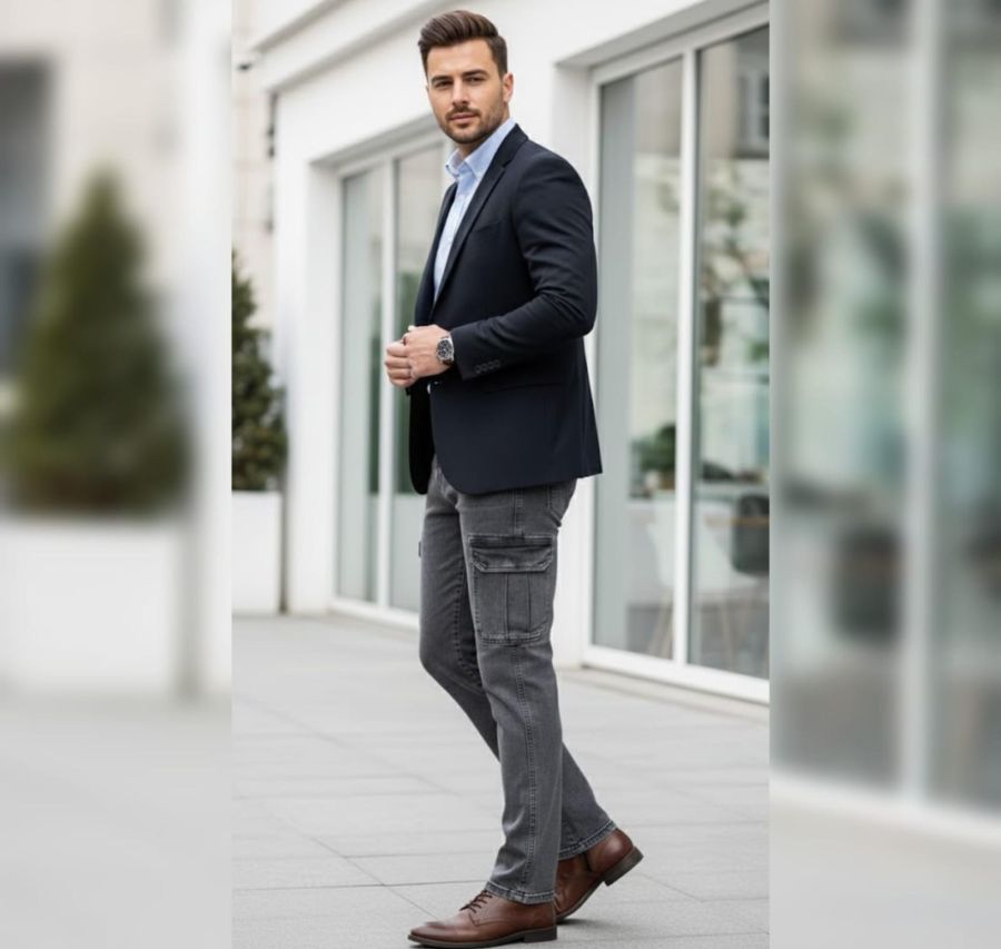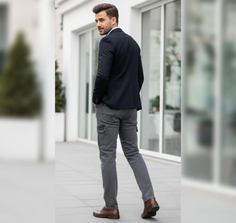 Upgrade your denim game with these versatile dark grey cargo jeans. Combining the classic durability of denim with the functional style of cargo pants, this pair features distinctive side-thigh pockets with secure flaps. The vintage-washed finish provides a rugged, lived-in look, while the slim-straight cut ensures a sharp silhouette that pairs perfectly with blazers, shirts, or casual tees.
