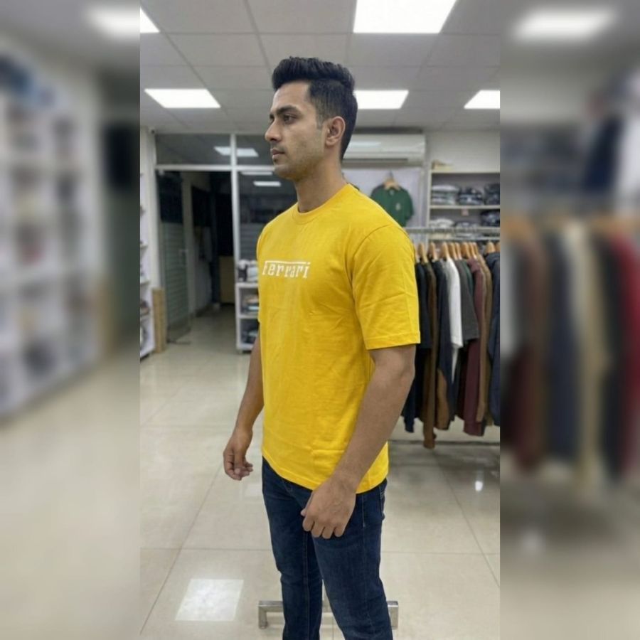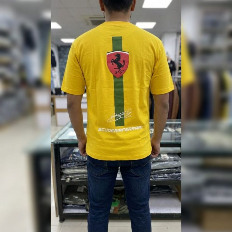 It looks like you're sporting a bold, vibrant yellow Ferrari T-shirt paired with classic dark denim—a solid, high-energy casual look. Yellow is a tricky color to pull off, but the fit on the shoulders and chest is working well for you.