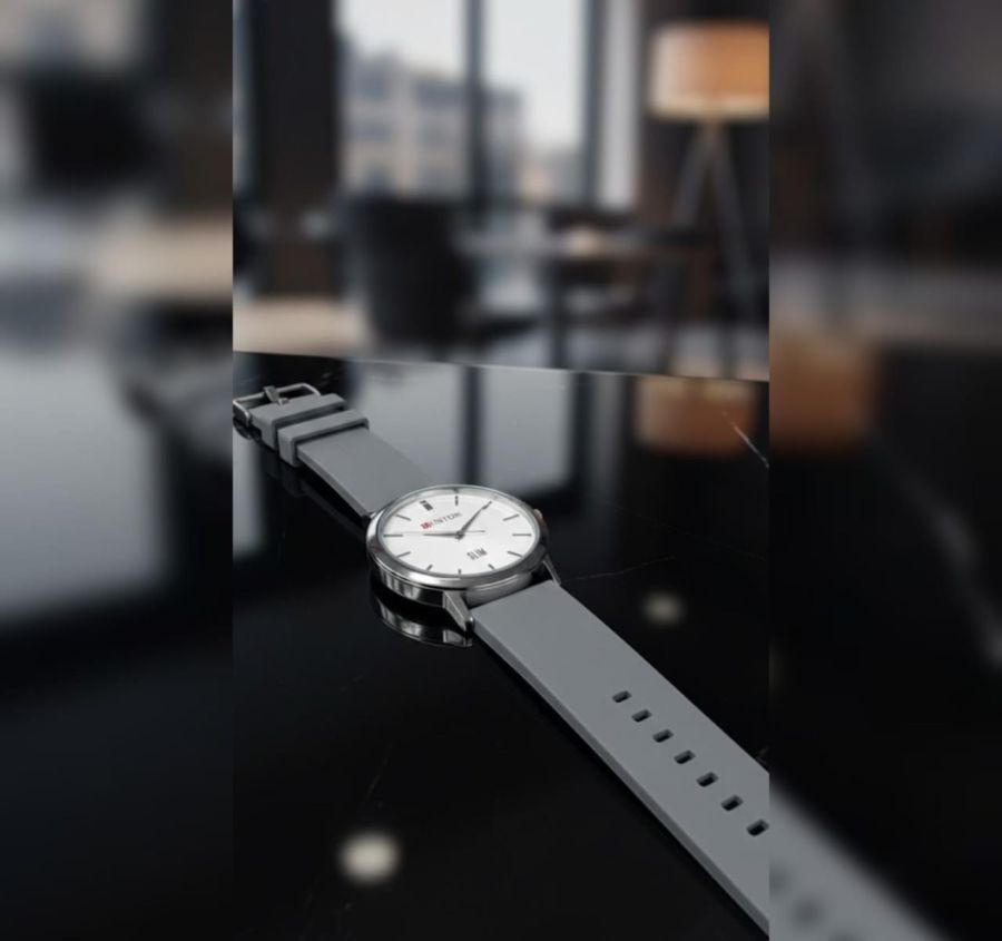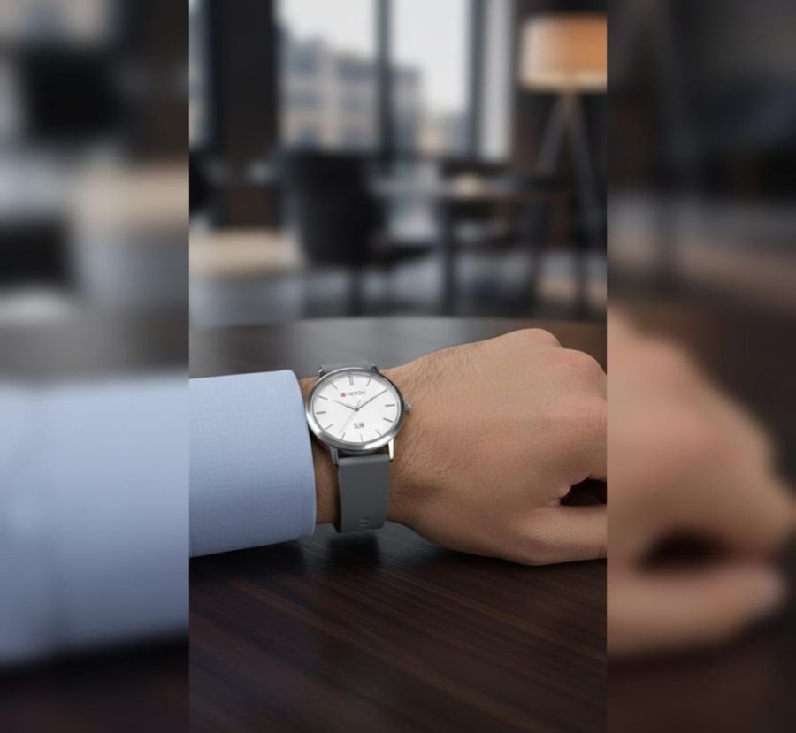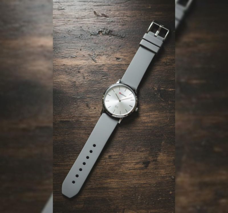 That is a very clean, minimalist piece. Based on the image, you have a dress watch with a modern twist, likely featuring a sunray silver dial and a matte grey silicone or rubber strap.