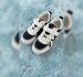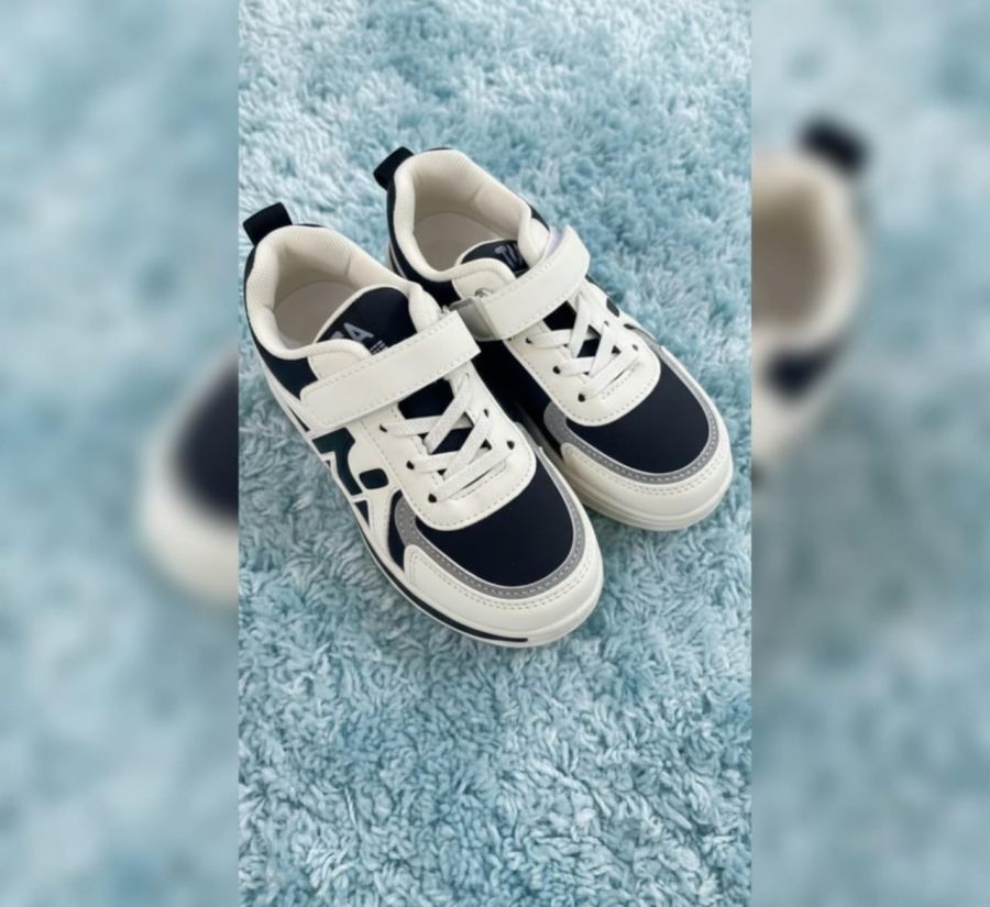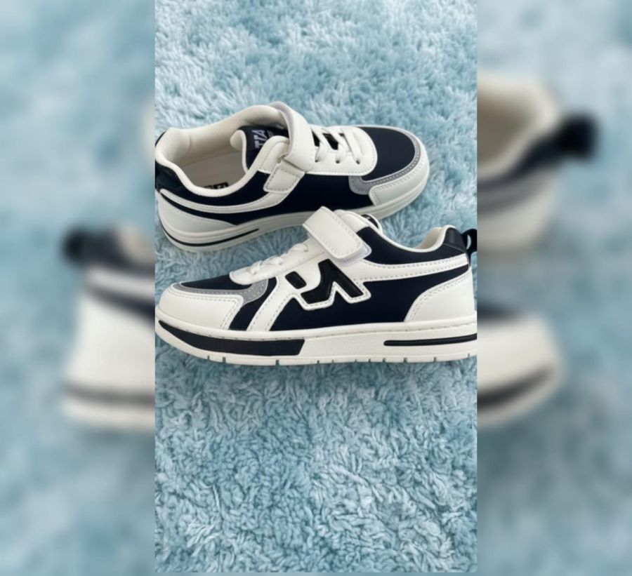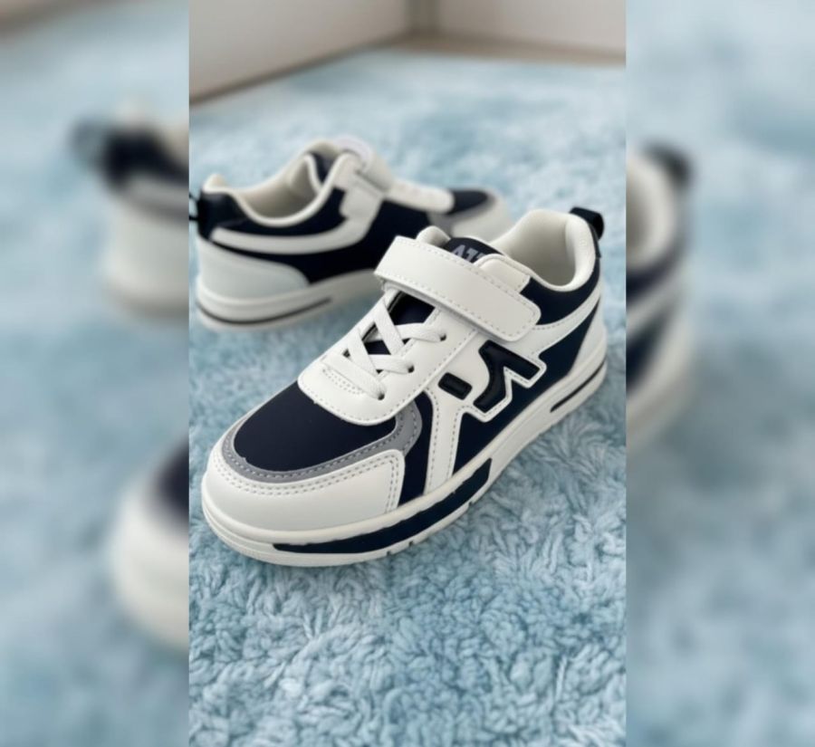 A stylish and durable pair of low-top sneakers designed for active kids. Featuring a secure hook-and-loop strap over elastic laces, these shoes provide a snug fit and easy "on-off" functionality. The high-contrast paneling and cushioned collar offer both a trendy aesthetic and all-day comfort.