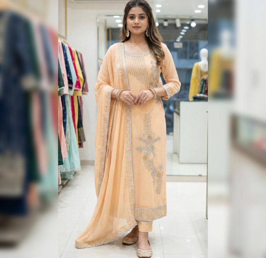 Premium lightweight material (likely Georgette or Crepe) that offers a graceful drape and a subtle sheen.