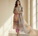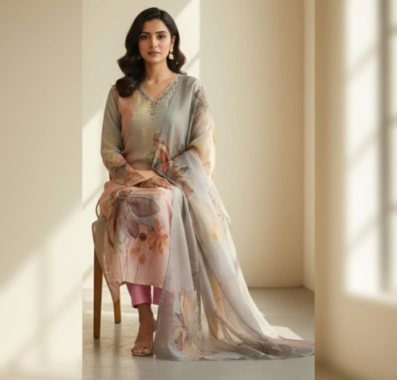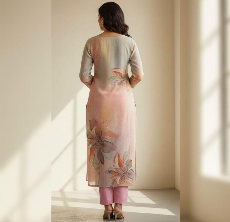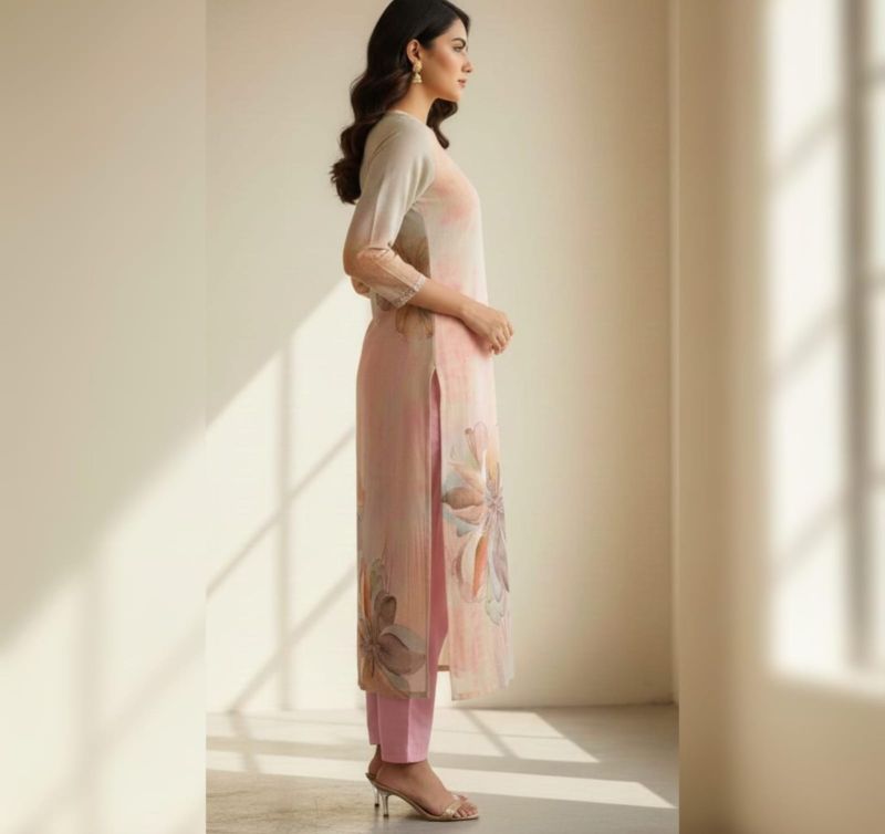 A contemporary take on ethnic wear, this suit features artistic, large-scale floral prints in a watercolor style. The V-neckline is accented with light beadwork, paired with contrast pink Japanese-style trousers for a fresh, vibrant look.