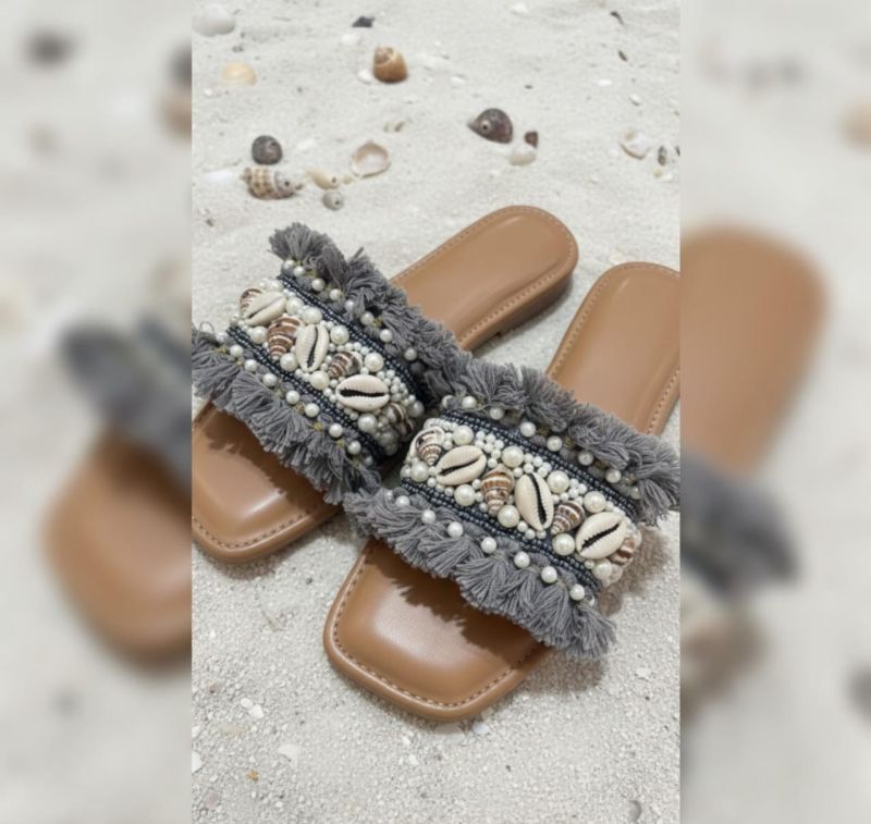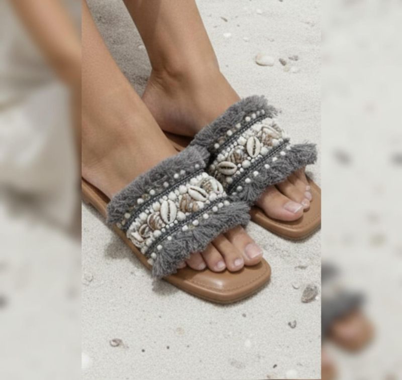 Step into vacation mode with these chic, boho-inspired flat sliders. They feature a textured slate grey fringe strap adorned with hand-placed cowrie shells and delicate pearls. Designed with a sleek square-toe bed, these sandals offer a perfect blend of beachside comfort and sophisticated style.