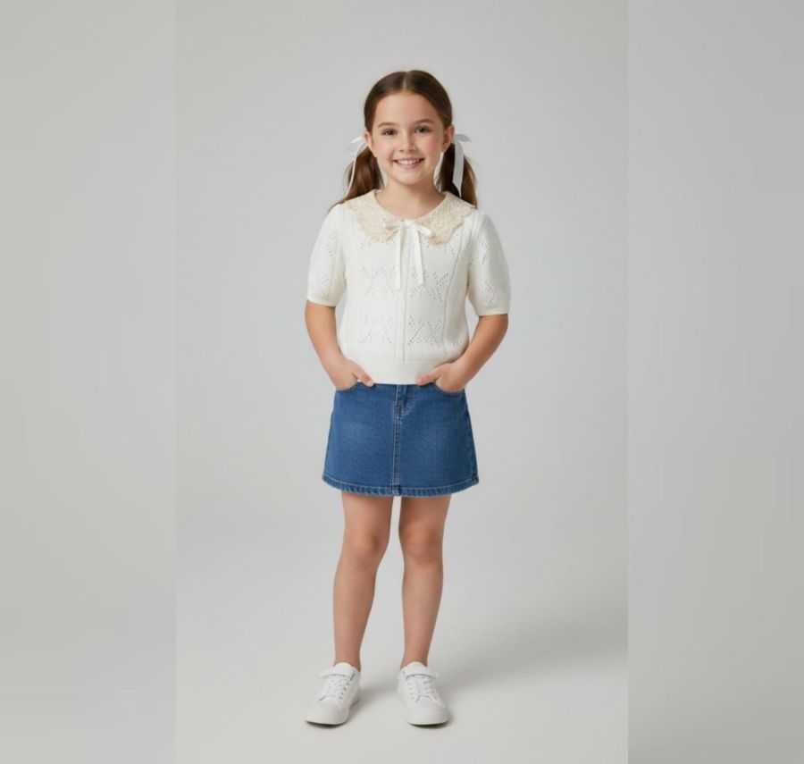 This elegant and dainty knit top is a perfect blend of vintage charm and modern comfort. Featuring delicate open-knit patterns and a decorative lace-trimmed collar, it is an ideal choice for a polished yet sweet look.