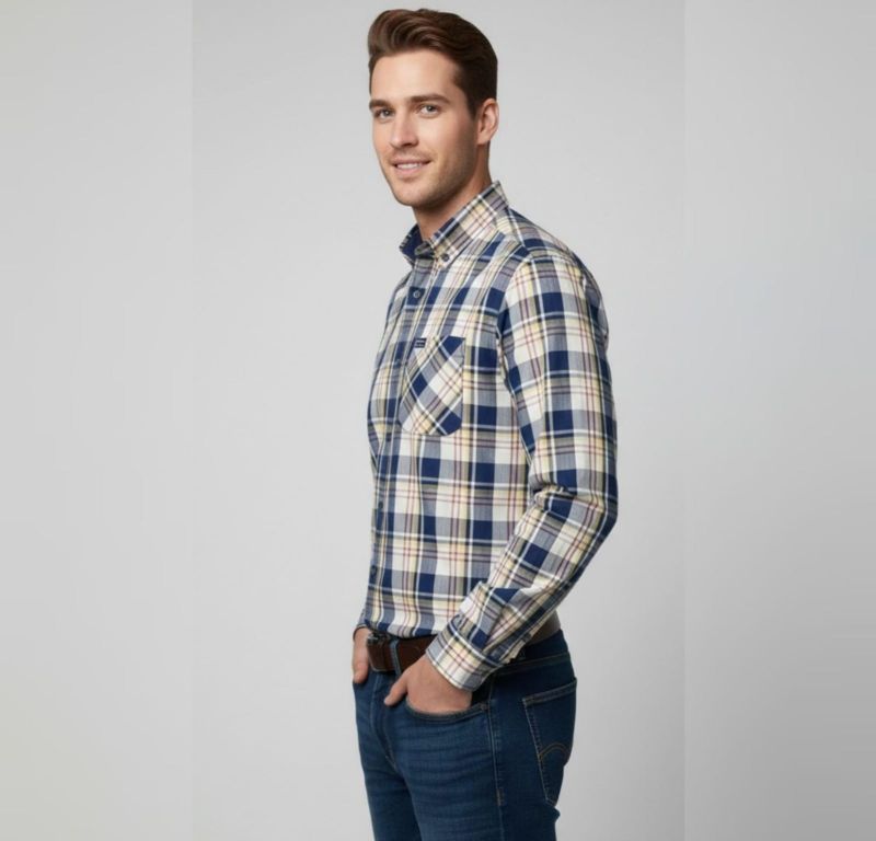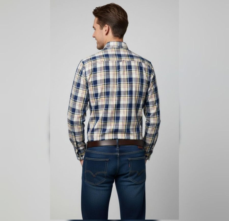 Lower Body: The shirt is paired with dark-wash indigo , which contrast well with the lighter colors of the plaid.