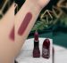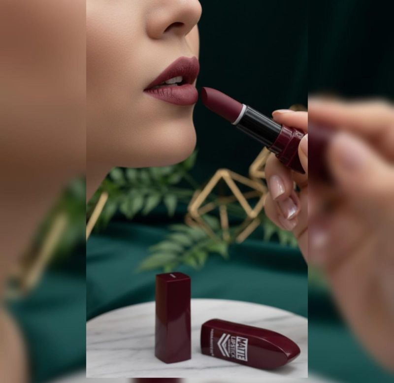 The cap (lying next to the lipstick) is also burgundy and features bold white typography that reads "MATTE LIPSTICK" alongside some decorative geometric lines.