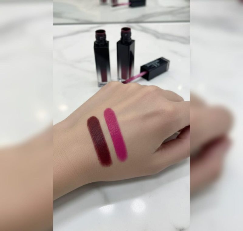 Applicators: The applicators are standard doe-foot wands, designed for precision when defining the lip line. One wand shows a vibrant magenta-pink residue, while the other appears to be a deeper berry.
