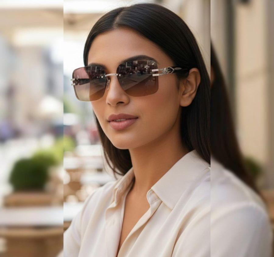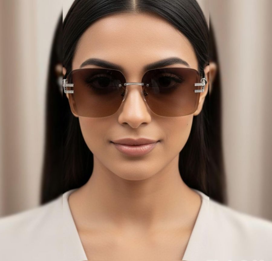 Lens Color: Brown Gradient (Coffee Tint) Hardware Finish: Silver-tone with Embedded Crystals Temple Material: Premium High-Gloss Acetate (Black)