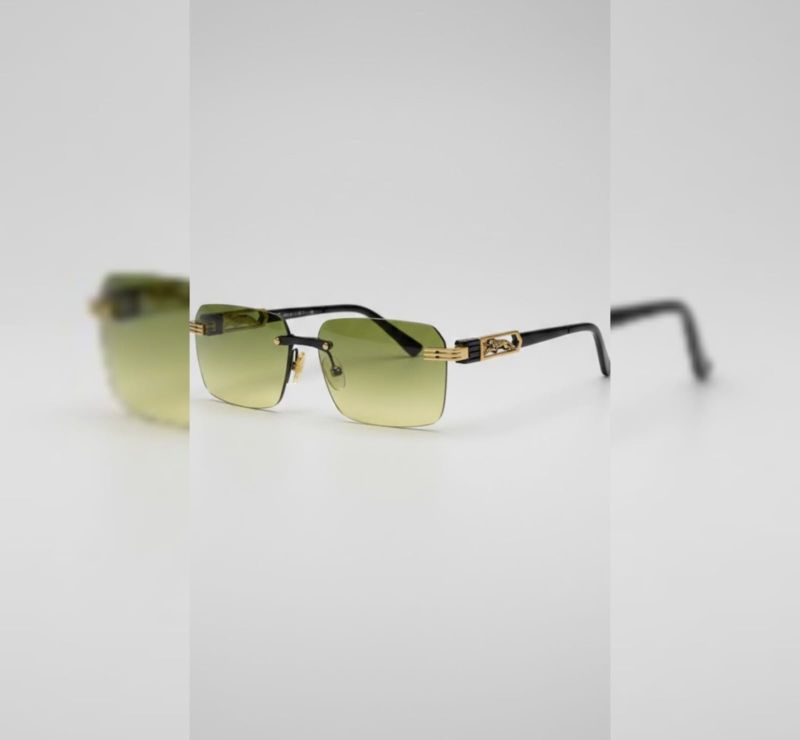 Hardware: Polished gold-tone bridge and hinges, featuring a signature "leaping panther" or big cat emblem on the temples.
