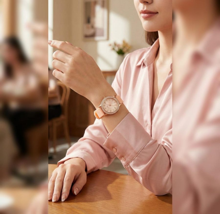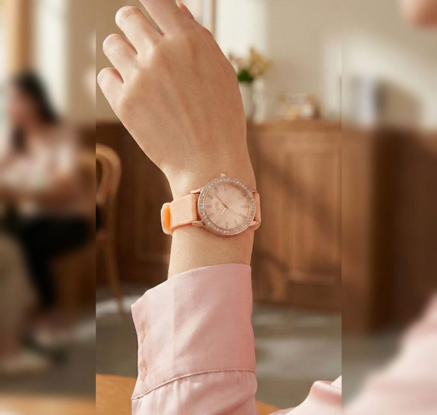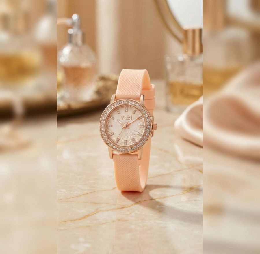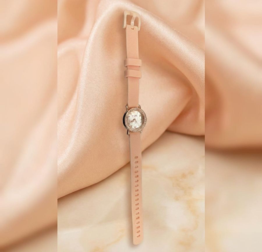 Elevate your everyday style with this stunning fusion of luxury and comfort. Featuring a delicate peach silicone strap and a dazzling diamond-encrusted bezel, this watch is designed for the modern woman who loves a hint of sparkle.