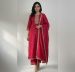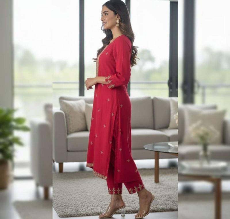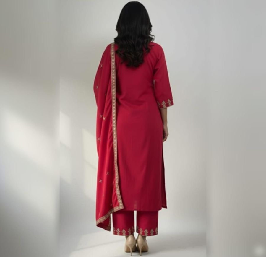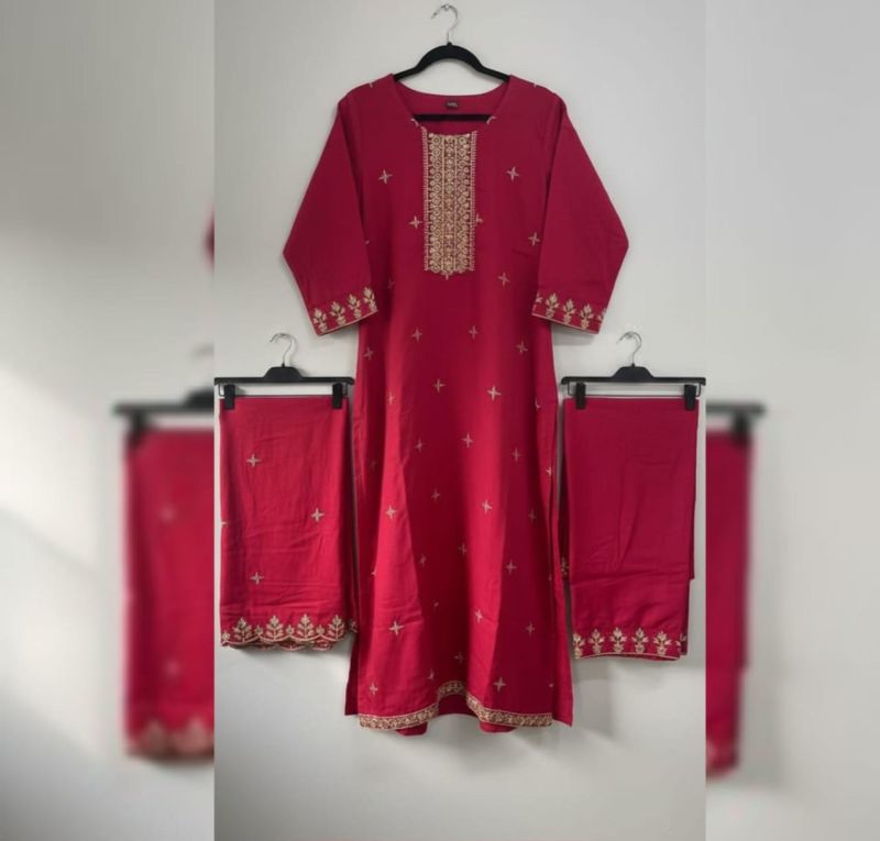 Make a grand entrance with the Royal Magenta Set. This exquisite three-piece ensemble features a deep magenta kurta enriched with stunning gold Zari-work embroidery on the neckline, sleeve cuffs, and hem. The fabric is punctuated with delicate gold star motifs throughout, paired perfectly with matching embroidered trousers and a heavy-border dupatta. It is the ultimate choice for weddings, festive celebrations, or formal evening events where you want to shine.