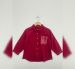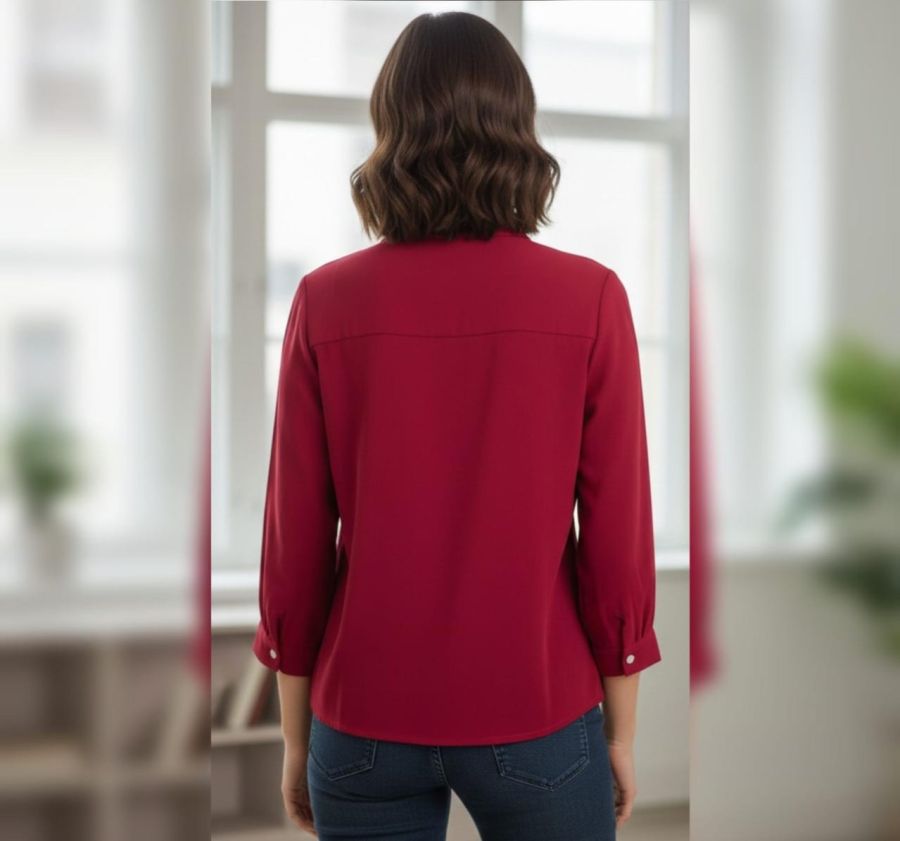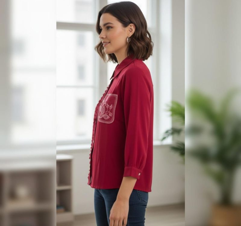 This eye-catching top features a rich deep red/crimson hue in a smooth, high-quality fabric. It is uniquely designed with a delicate ruffled trim along the button placket and a beautiful floral embroidered patch on the chest pocket. With its structured collar and elegant 3/4 sleeves, it strikes the perfect balance between professional and playful.